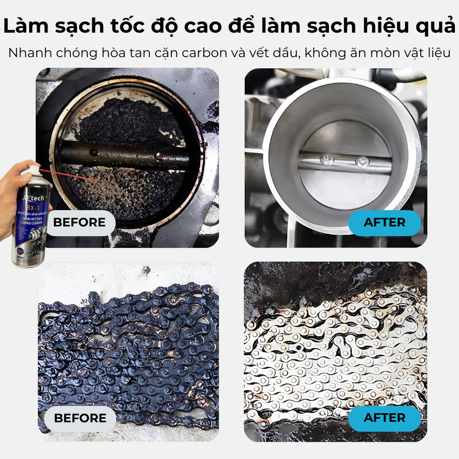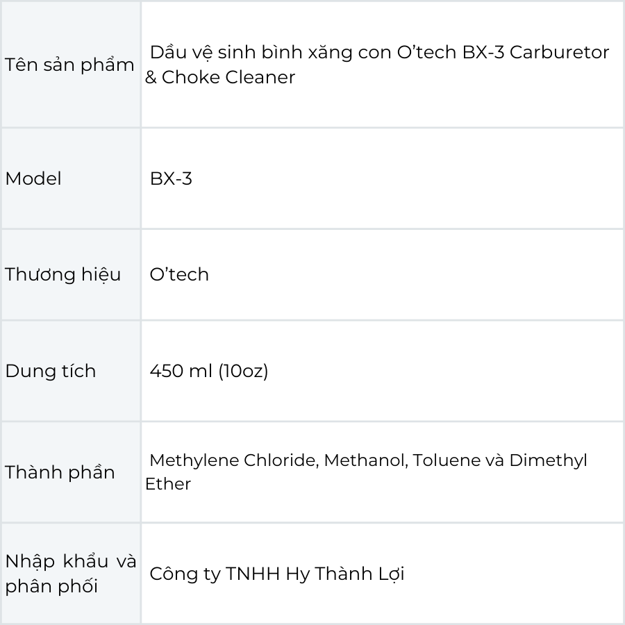 Bình xịt dầu vệ sinh bình xăng con O’tech BX-3 TÍNH NĂNG Bình xịt dầu vệ sinh bình xăng con BX-3 là một dung môi cực mạnh cho phép bạn làm sạch bộ chế hòa khí mà không cần tháo dỡ ra. Đơn giản chỉ cần xịt nó vào lỗ thông hơi của buồng phao để làm sạch bụi bẩn, cặn caron bên trong và xuống cổ họng một cách nhanh chóng và hiệu quả. Song song có thể xịt lên bên ngoài để làm sạch bên ngoài. Được dùng cho các xe máy, mô tô, ô tô, động cơ, thiết bị tàu thuyền, hàng không, cơ khí, thiết bị công nghiệp,… Ngoài ra bình xịt BX-3 còn dùng để vệ sinh dầu nhớt bám lâu ngày, vệ sinh sên, dùng được cho sên có phốt cao su.   THÀNH PHẦN VÀ CÔNG DỤNG BÌNH XỊT VỆ SINH BÌNH XĂNG CON Dầu vệ sinh bình xăng con O’tech BX-3 với các thành phần như DICHLOROMETHANE (METHYLENE CHLORIDE), METHYL ALCOHOL (METHANOL), METHYLBENZENE (TOLUENE), DIMETHYL ETHER. Mang lại nhiều lợi ích trong việc bảo dưỡng và tối ưu hóa hiệu suất của động cơ. Dưới đây là một số lợi ích cụ thể từng thành phần mang lại: