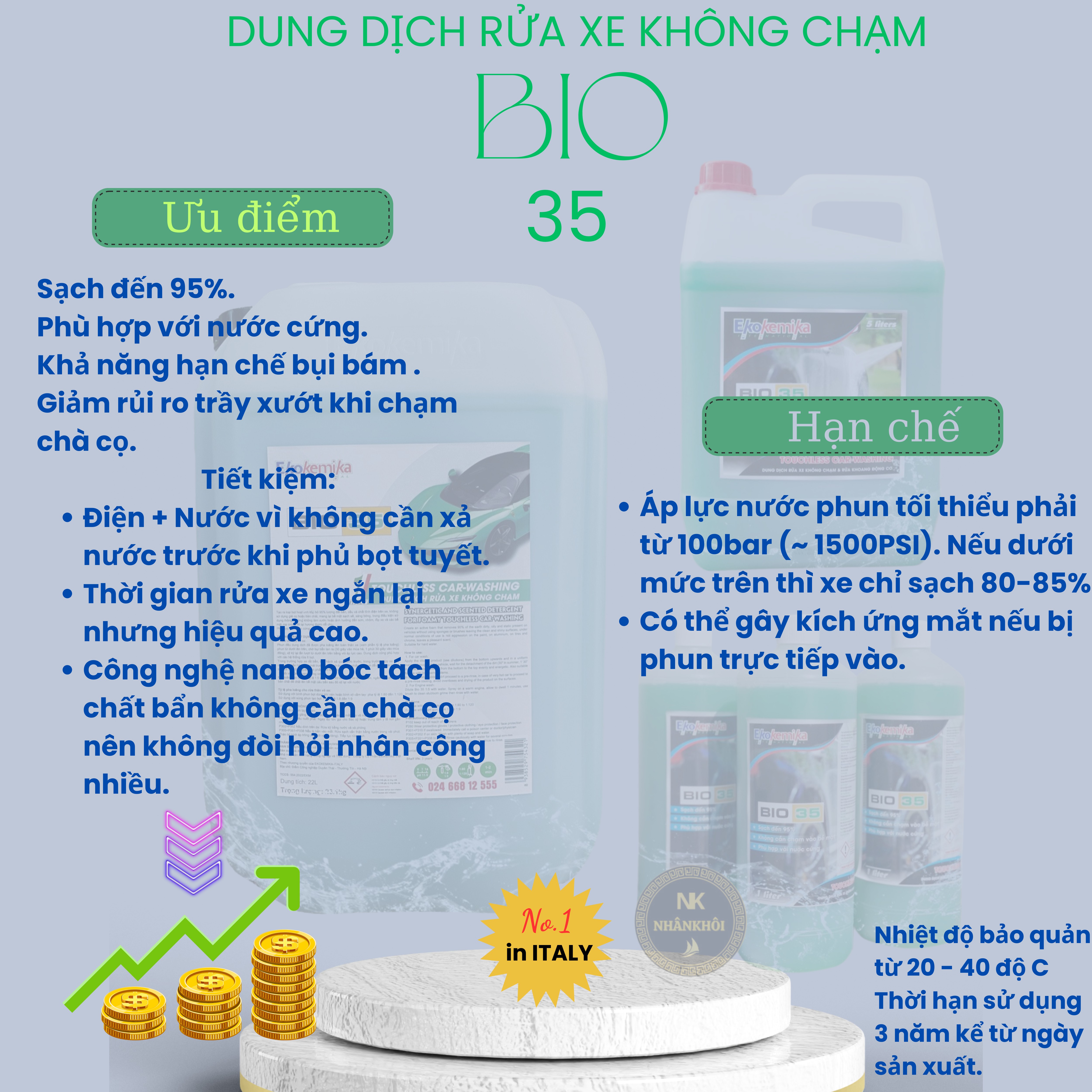 Dung dịch rửa xe không chạm - Nước rửa xe bọt tuyết Bio 35 - EkokemikaLà dung dịch gốc kiềm, tạo ra loại bọt hoạt tính siêu đậm đặc loại bỏ 95% lượng đất bẩn, dầu và chất tĩnh điện trên xe, không sử d...
