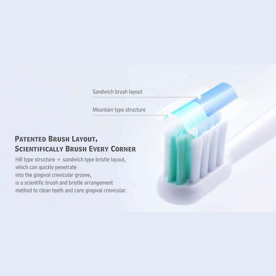 Cấu trúc hợp lý: Cấu trúc núi đôi + bố trí bàn chải sandwich, có thể đi sâu vào rãnh nướu nhanh chóng, là một phương pháp sắp xếp bàn chải khoa học để làm sạch răng và rãnh nướu