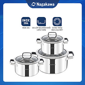 ✨Bộ 3 Nồi Đáy Từ Đa Lớp Nguyên Khối Inox 304 Cao Cấp Nagakawa NAG1353 (16cm, 20cm, 24cm) - Dùng Trên Mọi Loại Bếp - Hàng Chính Hãng