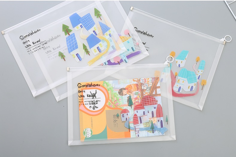 Bộ 3 túi zip đựng file đựng bút nhựa mềm họa tiết dễ thương Chất liệu nhựa dẻo mềm trong suốt, có khóa kéo zip chống thấm nước Họa tiết dễ thương Phù hợp cho