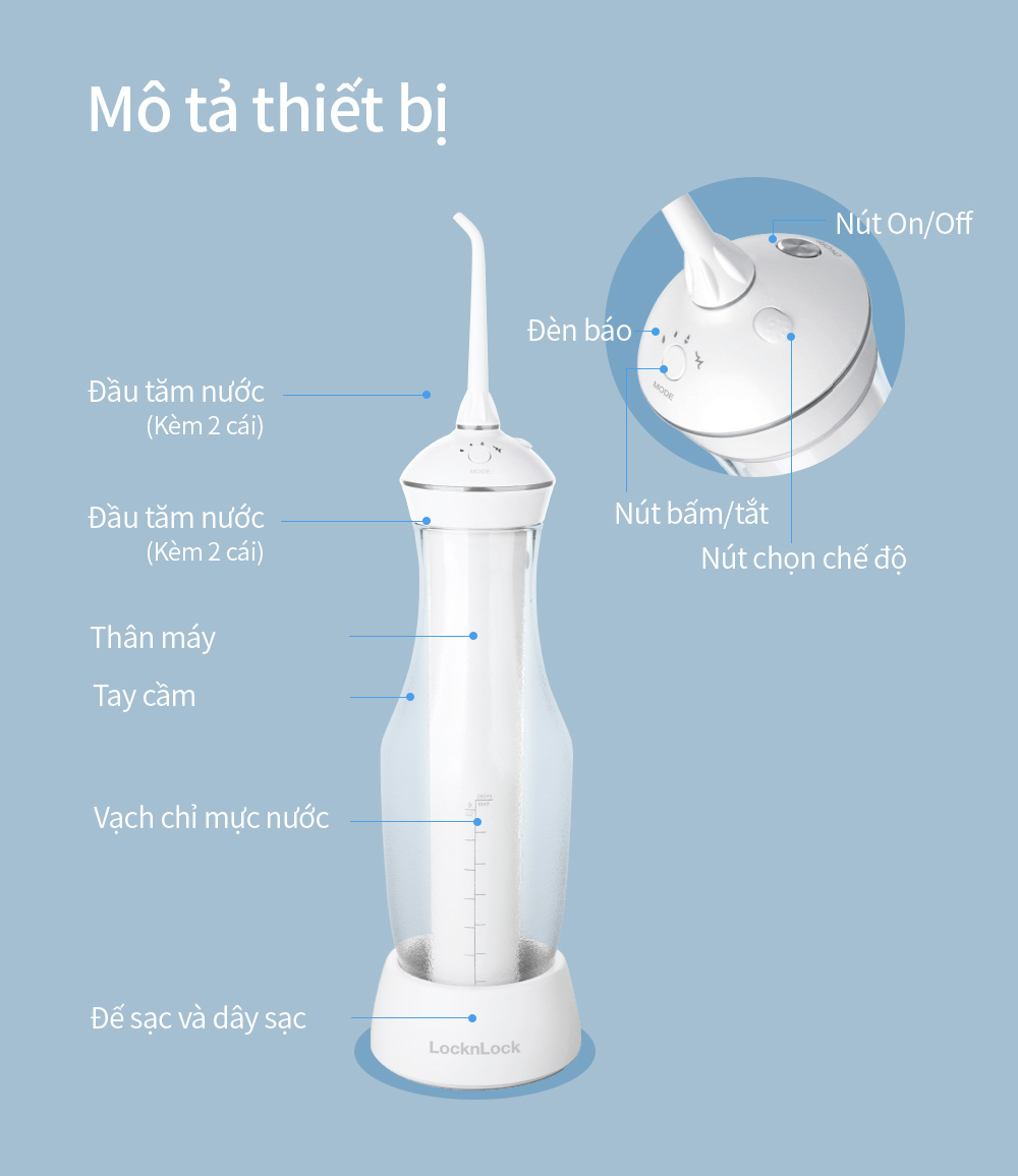 Đầu tăm nước thay thế tăm nước ENR154WHT LocknLock Replacement heads ENR154WHT_RB ENR154WHT_RB: đầu tăm thay thế cho máy tăm nước ENR154WHT Đầu thay thế ENR154WHT_RB: nhựa ABS, sợi nylon, sợi silicone 1. Đầu tăm