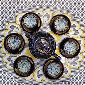 - Đĩa kê được thiết kế thẩm mỹ. Men đen bóng đồng bộ với ấm và chén. Họa tiết được điểm xuyết tinh tế trên đĩa. Tổng thể: