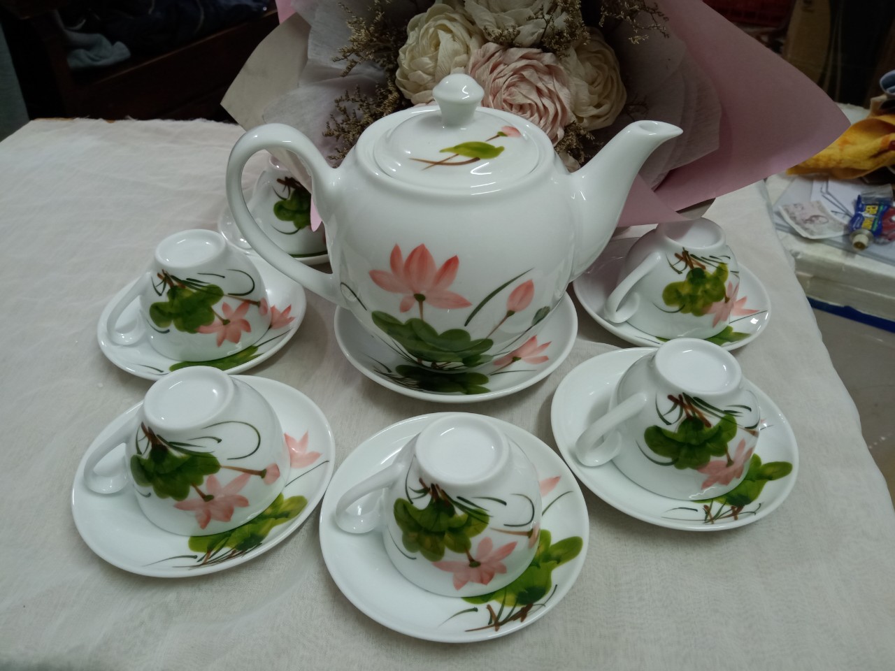 Bộ sản phẩm bao gồm: 1 ấm trà, 1 đĩa ấm, 6 chén trà, 6 đĩa chén Hoa sen là biểu tưởng đẹp về đức tính con người Việt: mạnh mẽ vươn lên, không