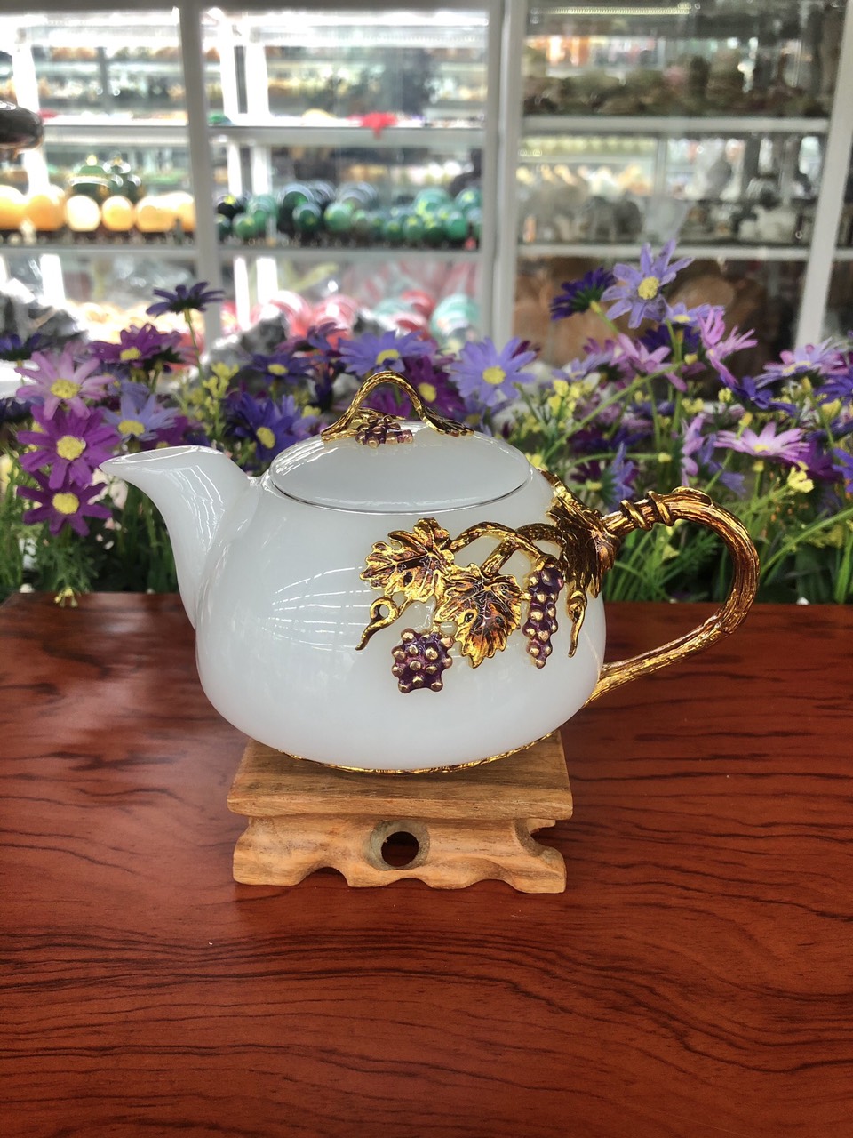 ✨Bộ ấm trà chạm cây nho tím với ly chạm chữ đá bạch ngọc