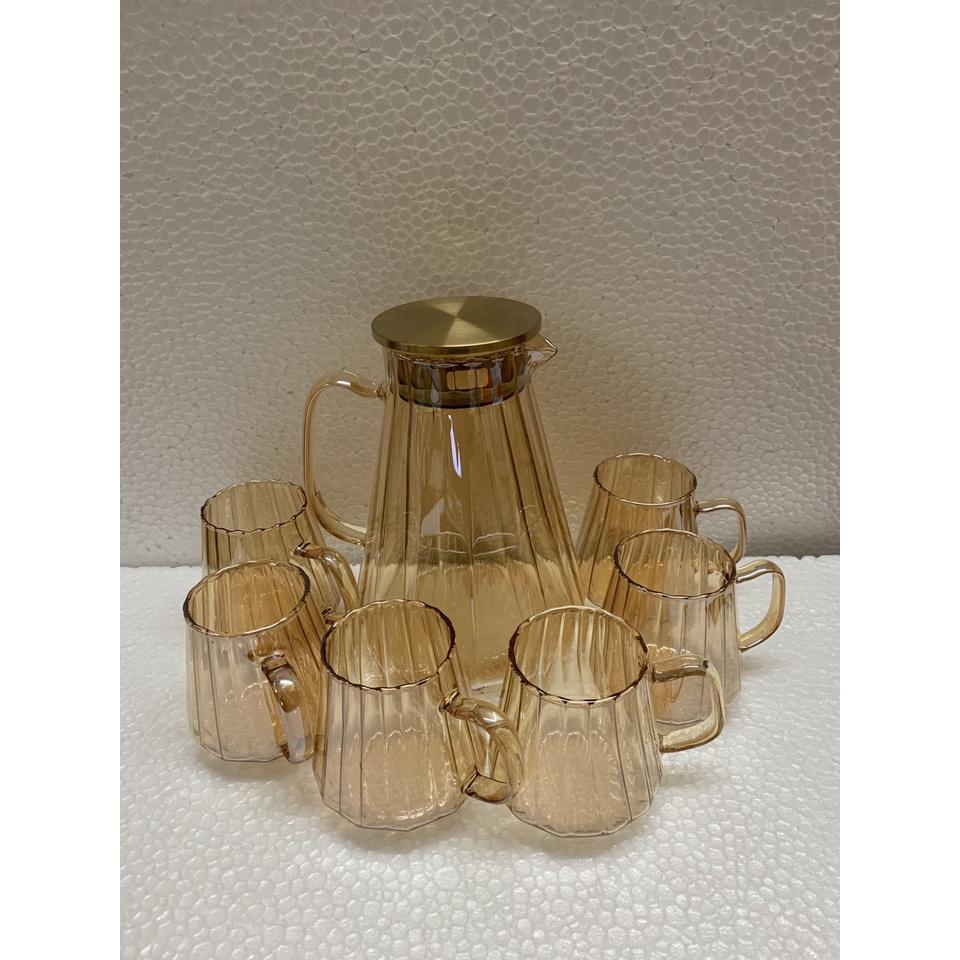 ✨BỘ BÌNH ĐỰNG NƯỚC UỐN KÈM 6 CỐC THỦY TINH MÀU VÀNG GOLD CHỊU NHIỆT CAO CẤP