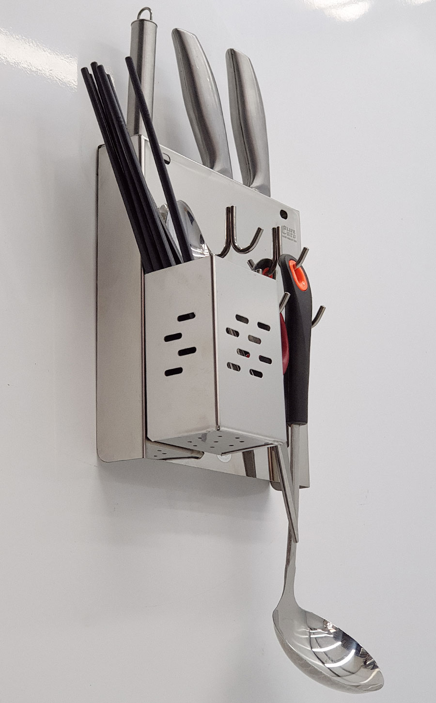 Kệ được tích hợp bộ cài dao ngay sau sống kệ cực kỳ tiện dụng và an toàn. Ngoài ra kệ còn có thể treo vá-muỗng lớn, và phụ kiện bếp.