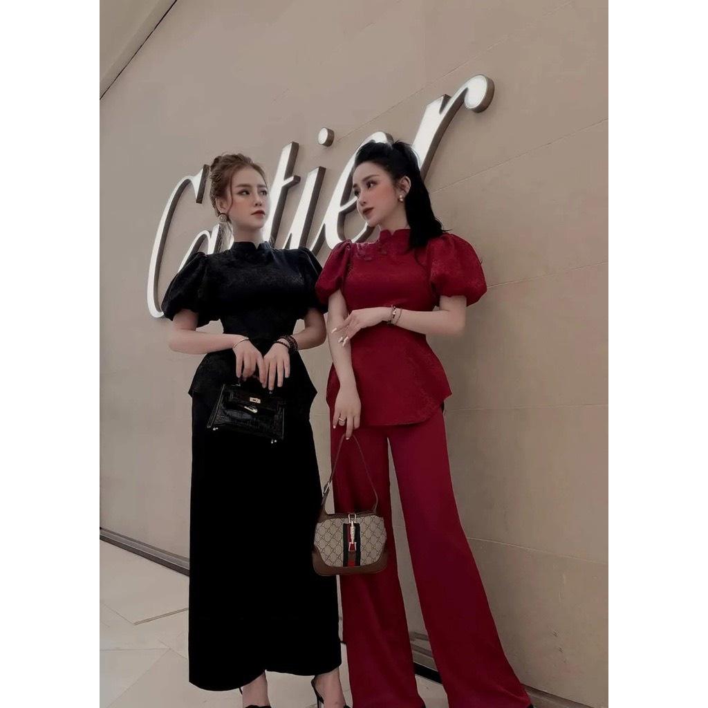 - Áo thiết kế cổ trụ tay phồng trang trọng kính đáo họa tiết gấm nổi sang trọng