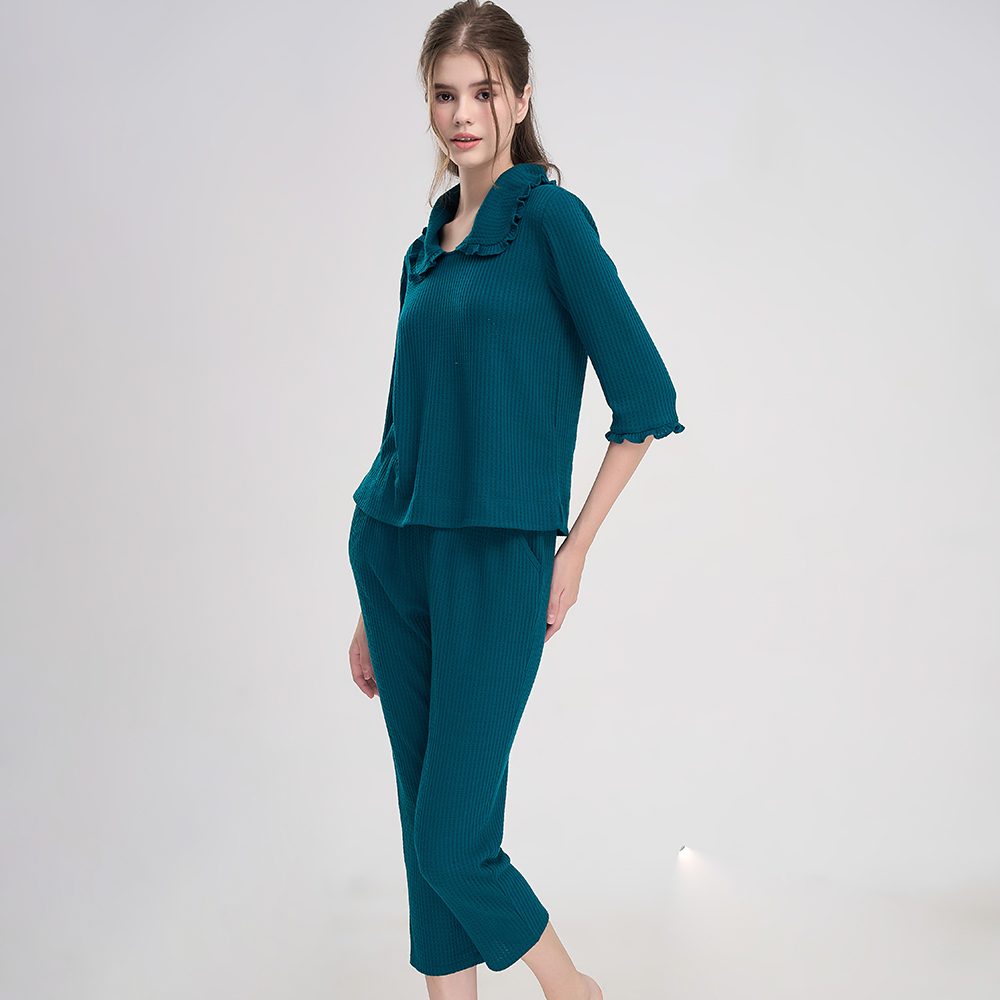 Đặc điểm nổi bật: - Cổ lá sen, tay lỡ - Kẹp ren trắng ở phần lá cổ, lai tay, lai quần - Chất liệu thun - Dáng bộ đồ dài - Thiết kế và
