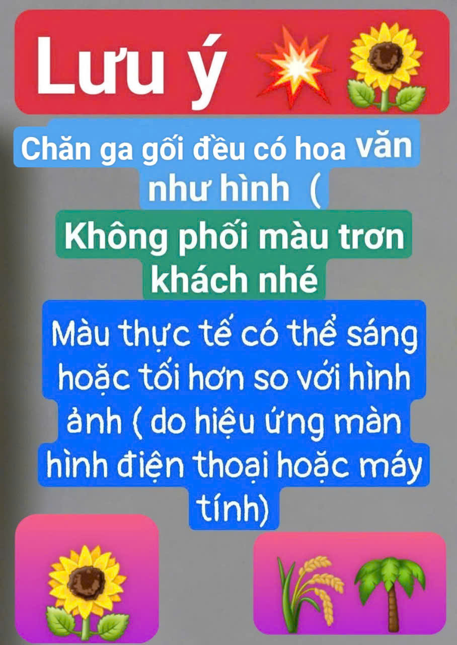 Sản phẩm gồm: 2 lựa chọn Lựa chọn 1 : Set vỏ chăn : 1 VỎ CHĂN + 1 GA BỌC NỆM + 2 VỎ GỐI NẰM Lựa chọn 2 :set chăn Phao: 1 Chăn
