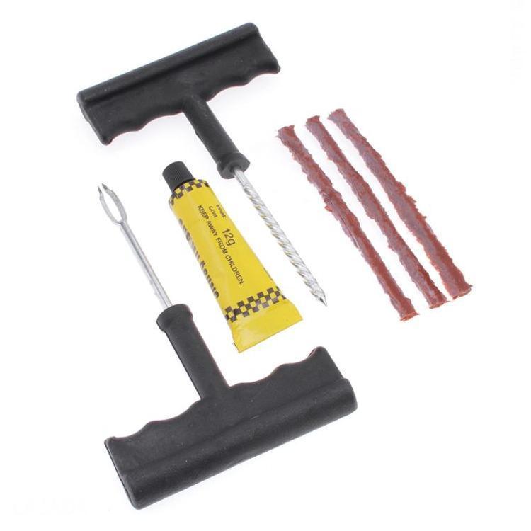 Bộ sản phẩm Dụng Cụ Vá Lốp Không Săm gồm : 1 cây dùi, 1 cây gim, 1 chai keo 12ml và 3 sợi cao su non.