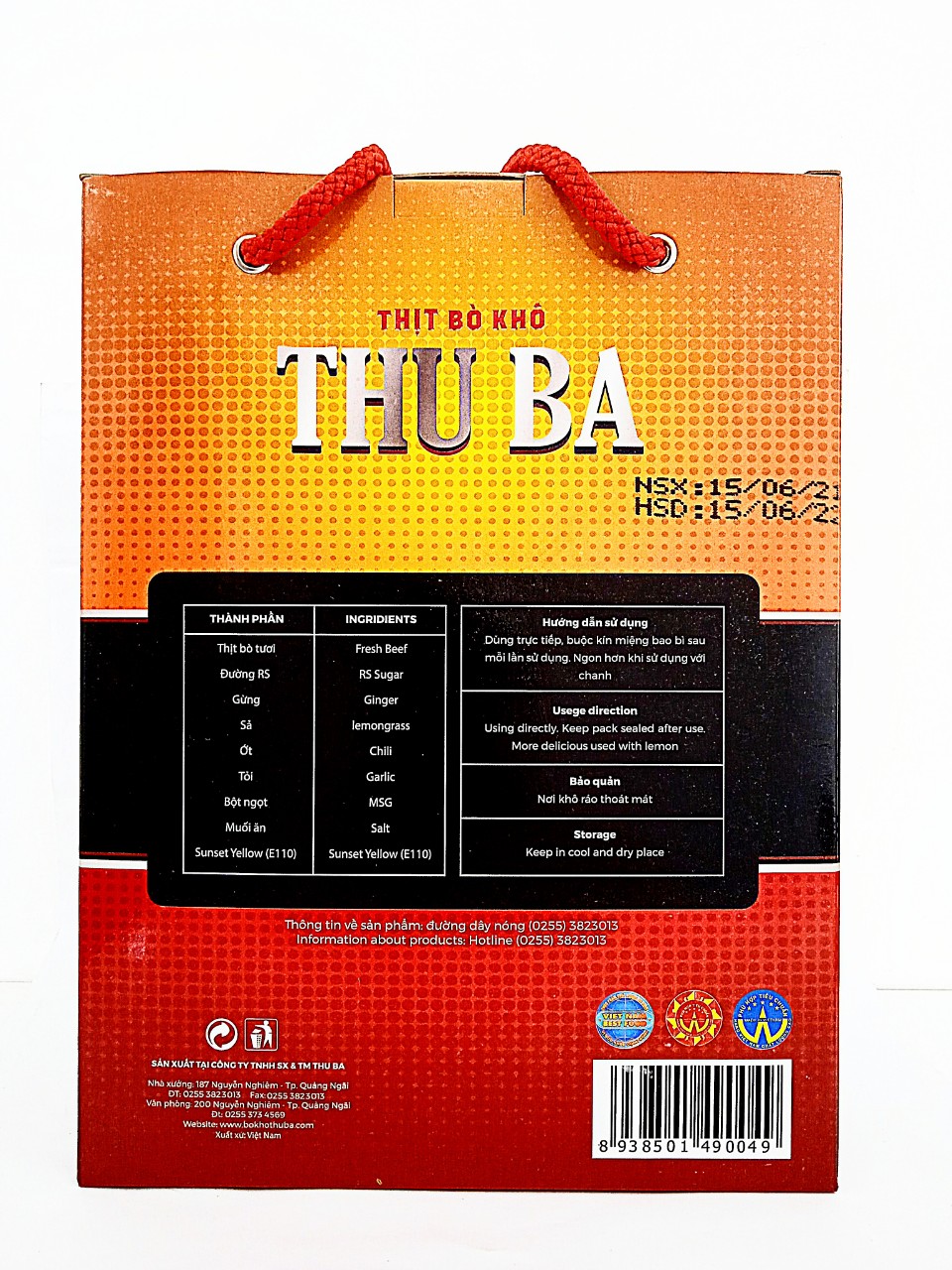 Bao bì có thể thay đổi theo từng đợt sản xuất, chất lượng không đổi Được làm từ 100% thịt bò bò tươi Không chất bảo quản độc hại BÒ KHÔ THU BA là món đặc