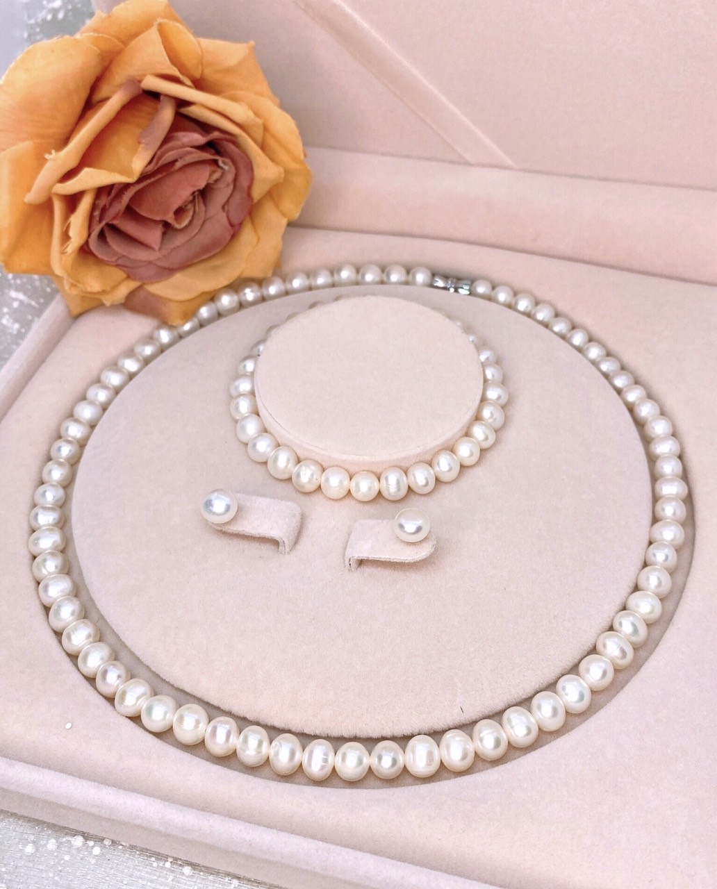 Mua tại Tiktok*** Bộ Ngọc Trai nuôi thiên nhiên gồm vòng cổ 40cm vòng tay 16cm-18cm khuyên tai kích thước bộ từ 8ly - 9ly.