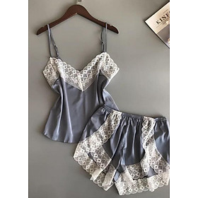 Đồ mặc nhà đồ ngủ quần đùi 2 dây viền ren chất satin cao cấp (50-62kg)