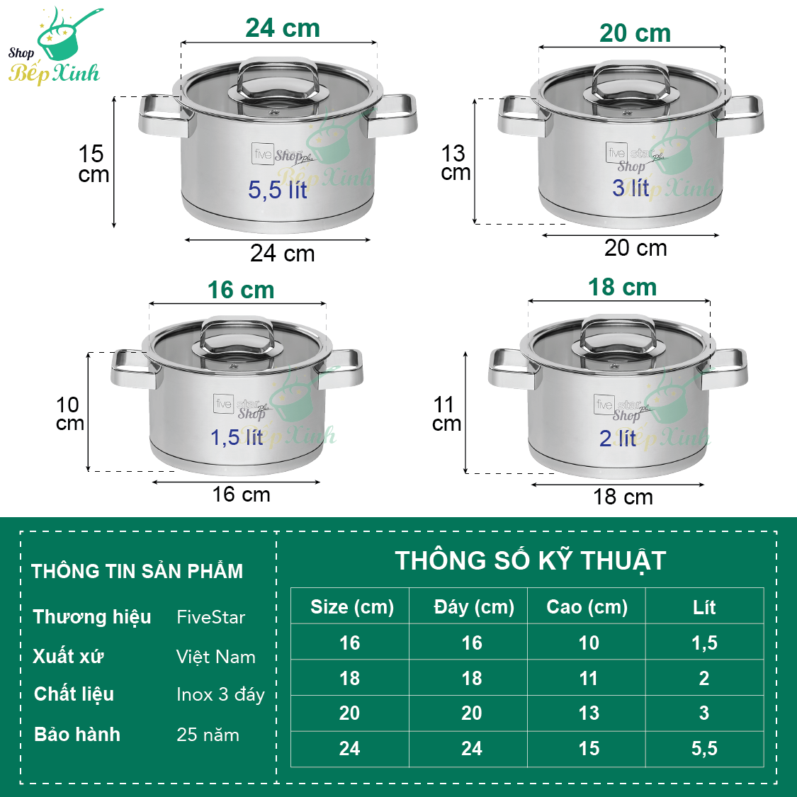 Bộ nồi gồm có : +1 Nồi Fivestar đường kính 16cm, chiều cao 9cm + nắp inox quai silicon + 1 Nồi Fivestar đường kính 20cm, chiều cao 12cm + nắp inox quai silicon +