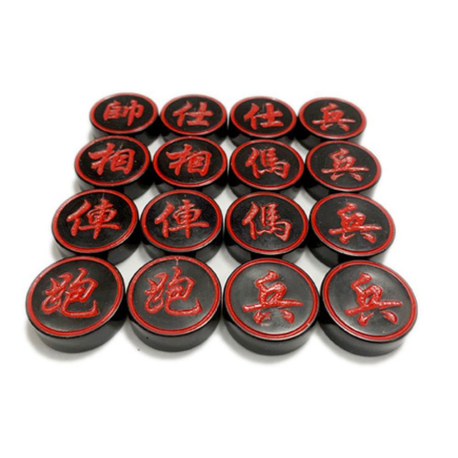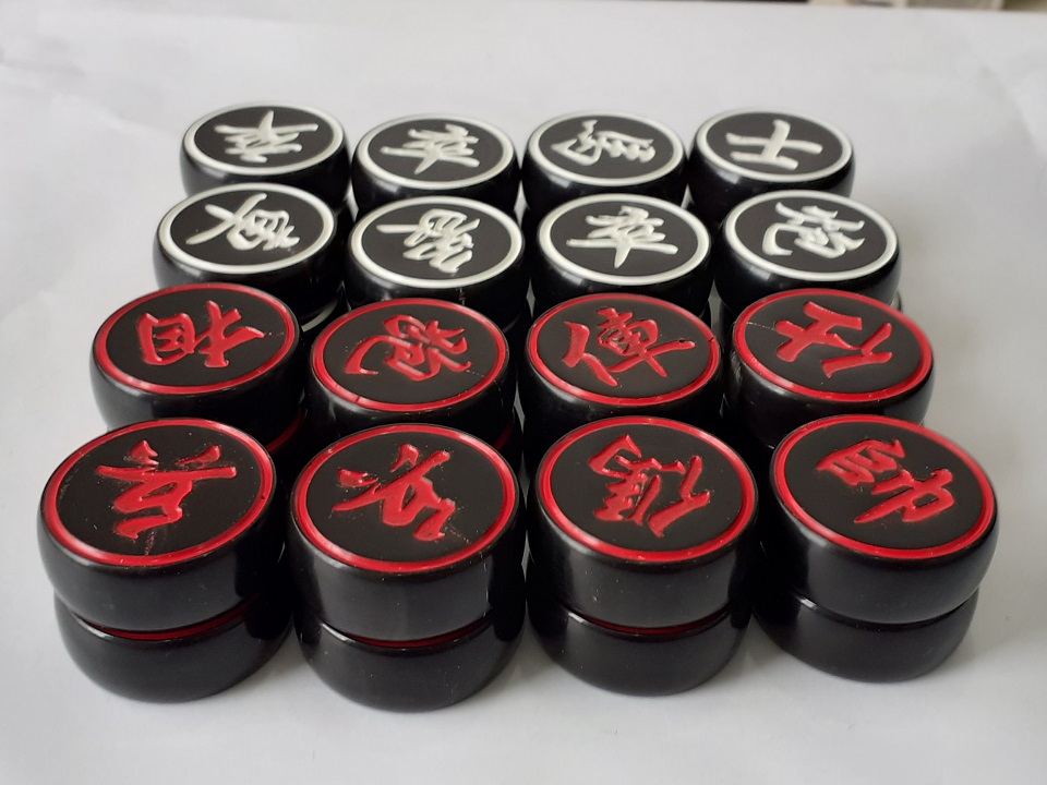 - Quân cờ sừng đên hai bên, 16 quân chữ mầu trắng và 16 quân chữ mầu đỏ, quân cờ sừng trâu đen.
