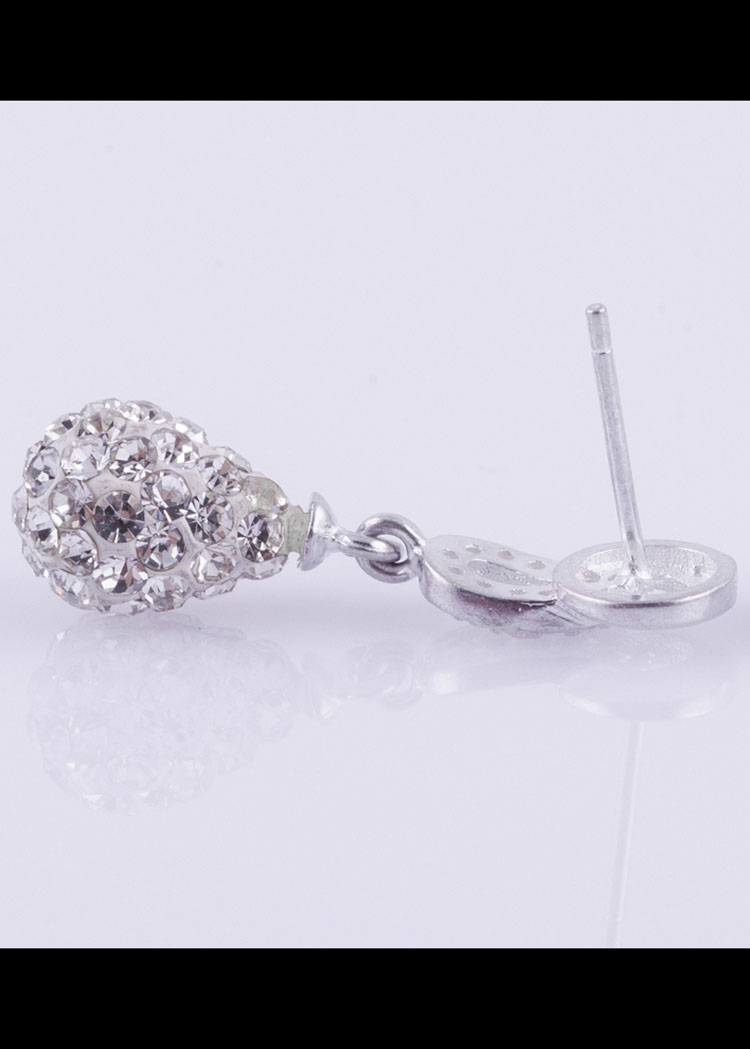 Phía trên sản phẩm được đính đá hai hình oval lồng vào nhau rất mềm mại, phía dưới được gắn quả cầu pha lê hình giọt nước rất thanh thoát, nhẹ nhàng.