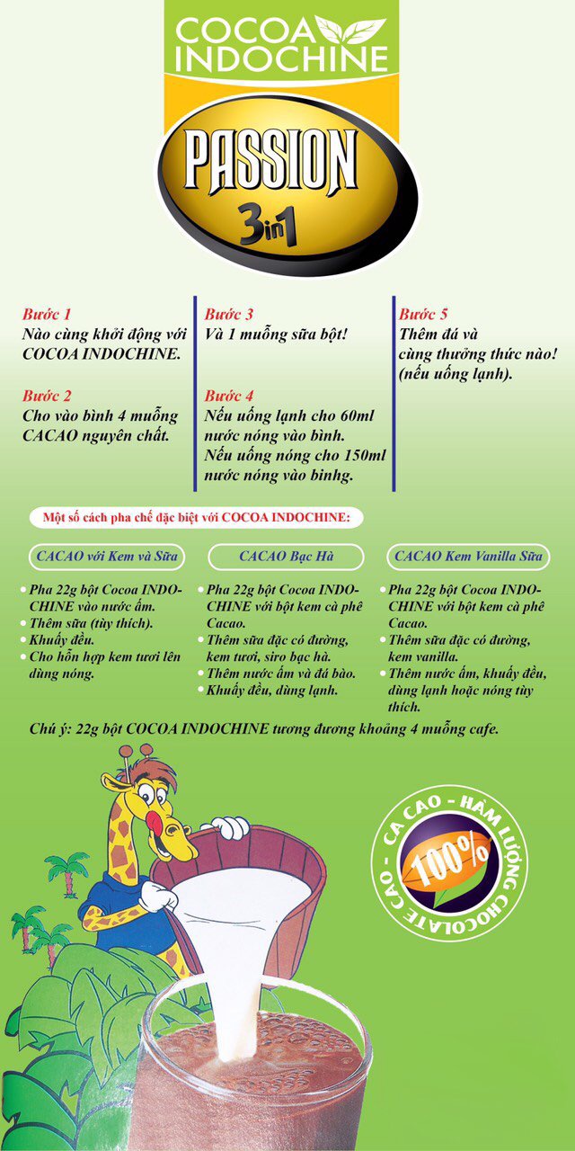 Bột Cacao Hòa Tan Passion 3 In 1 Cocoa Indochine (Hộp 15 Gói x 16g) có mùi vị thơm ngon, giàu dinh dưỡng với thành phần bột Cacao thiên nhiên nguyên chất tốt nhất thế giới.