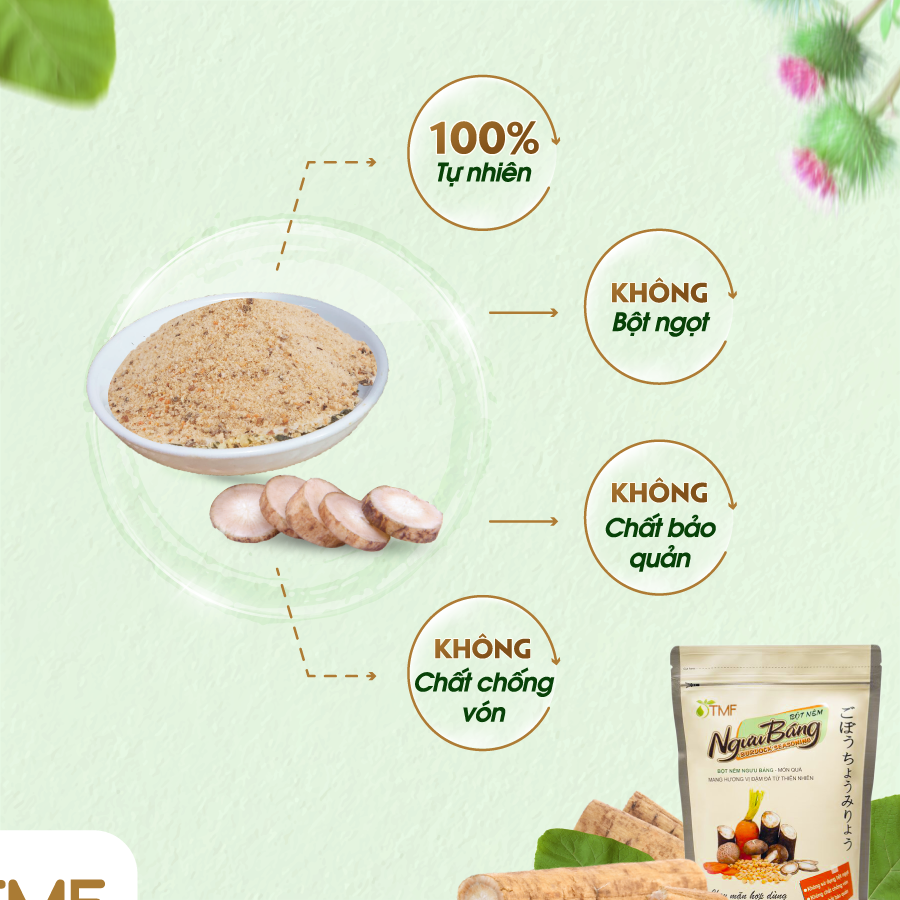 Bột nêm Ngưu Báng – Món quà mang hương vị đậm đà từ thiên nhiên. Thành phần: muối, ngưu báng, nấm đông cô, cà rốt, protein đậu nành, chiết xuất lúa mạch, đường vàng.  Bột