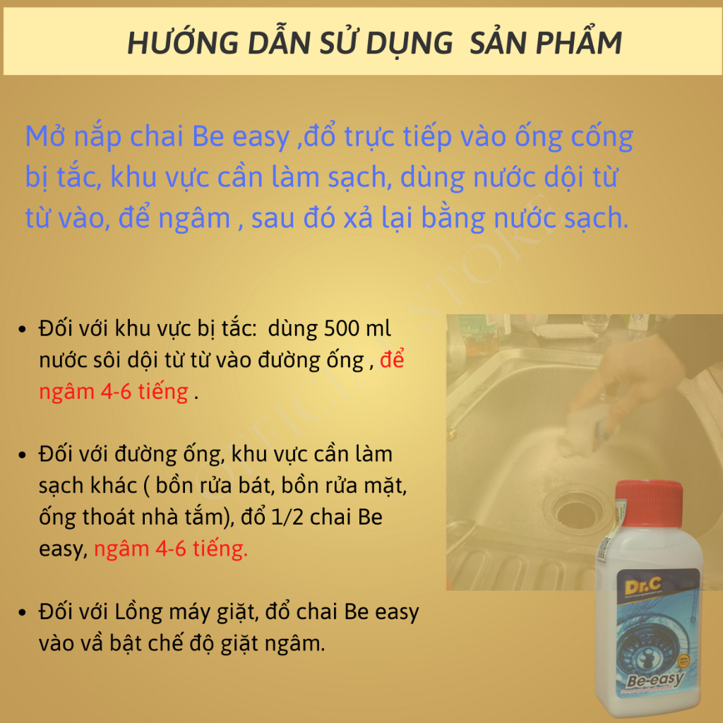 • Loại bỏ mùi hôi khó chịu từ các ống thoát nước, diệt vi khuẩn gây mùi hôi, giúp đường ống sạch hơn, chống tắc nghẽn. * SHOP CAM KẾT SẢN PHẨM CHÍNH HÃNG, cam kết hoàn tiền gấp 10 lần nếu sử dụng không hiệu quả, đổi trả và hoàn tiền miễn phí 100% nếu hàng bị lỗi hỏng do nhà sản xuất. HƯỚNG DẪN SỬ DỤNG Mở nắp chai Be easy ,đổ trực tiếp vào ống cống bị tắc, khu vực cần làm sạch, dùng nước dội từ từ vào, để ngâm , sau đó xả lại bằng nước sạch. Đối với khu vực bị tắc: dùng 500 ml nước sôi dội từ từ vào đường ống , để ngâm 4-6 tiếng . Đối với đường ống, khu vực cần làm sạch khác ( bồn rửa bát, bồn rửa mặt, ống thoát nhà tắm), đổ 1/2 chai Be easy, ngâm 4-6 tiếng. Đối với Lồng máy giặt, đổ chai Be easy vào vầ bật chế độ giặt ngâm.