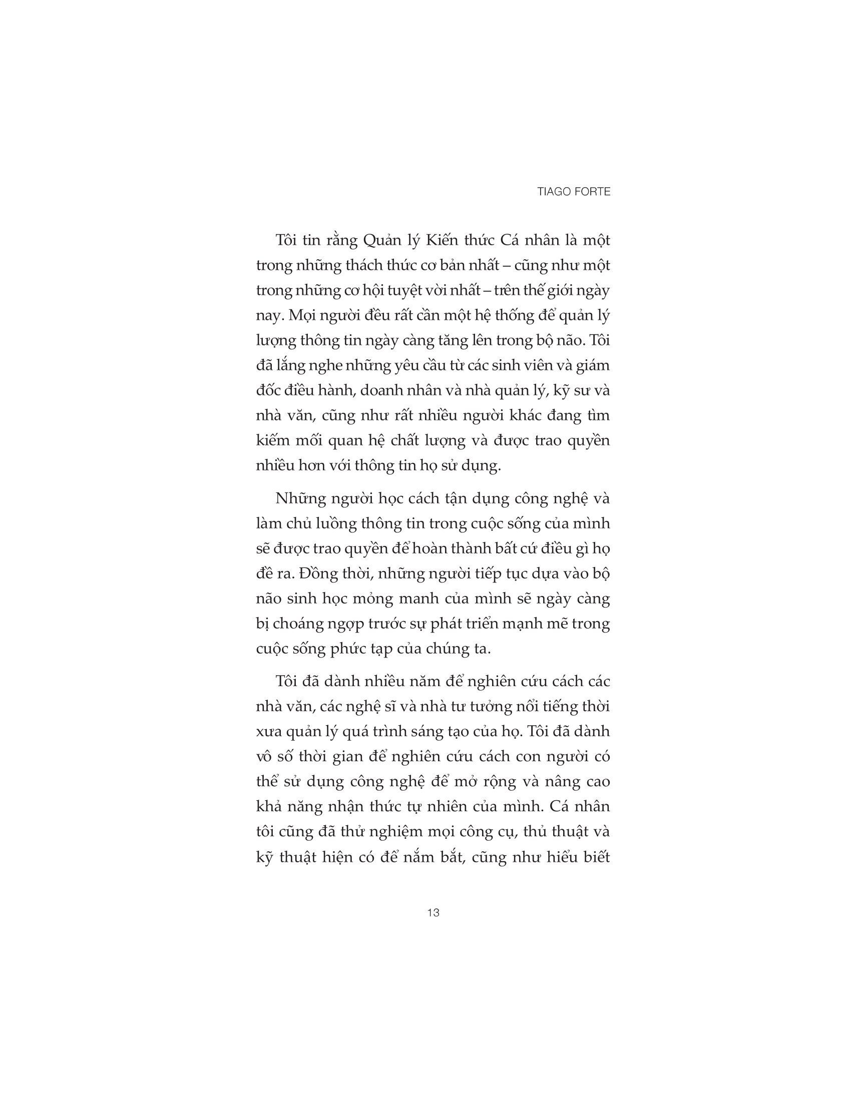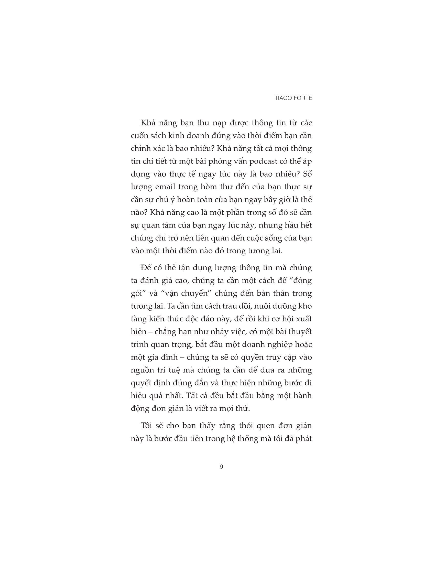 • Cách tự động hóa và tối ưu hóa quy trình lưu trữ và xử lý thông tin. Hãy khám phá toàn bộ tiềm năng của các ý tưởng và biến những gì bạn biết thành những cải tiến mạnh mẽ hơn, có ý nghĩa hơn trong công việc và cuộc sống bằng cách thiết lập nên Bộ não thứ hai của riêng m.ình. Về tác giả: TIAGO FORTE là một trong những chuyên gia hiệu suất hàng đầu trên thế giới, đã giảng dạy cho hàng nghìn người về các nguyên tắc thời gian và công nghệ tiên tiến nhất có thể cách mạng hóa năng suất, sự sáng tạo và hiệu quả cá nhân. Ông đã từng làm việc với nhiều tổ chức như Genentech, Tập đoàn Toyota Motor và Ngân hàng Phát triển Inter-American. Tiago Forte xuất hiện trên nhiều ấn phẩm như New York Times, The Atlantic và Harvard Business Review.