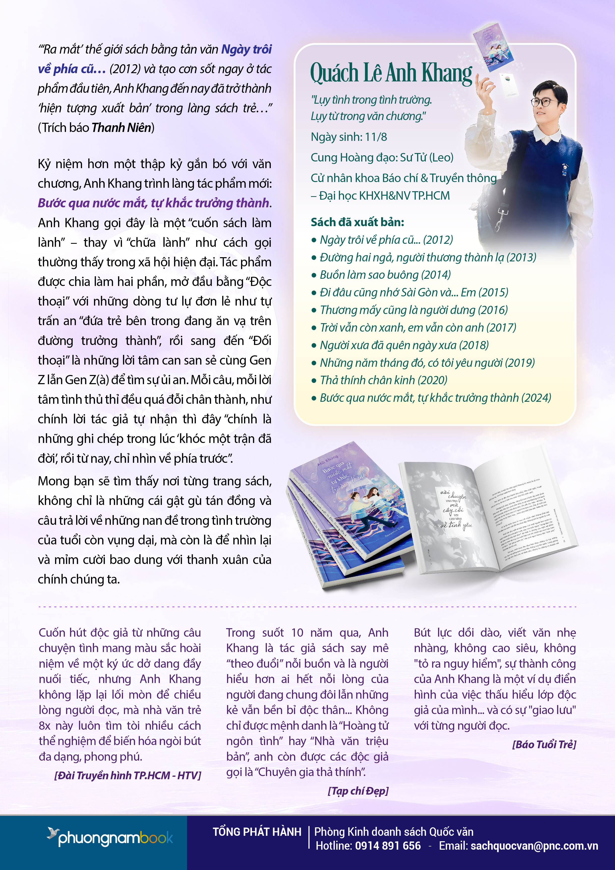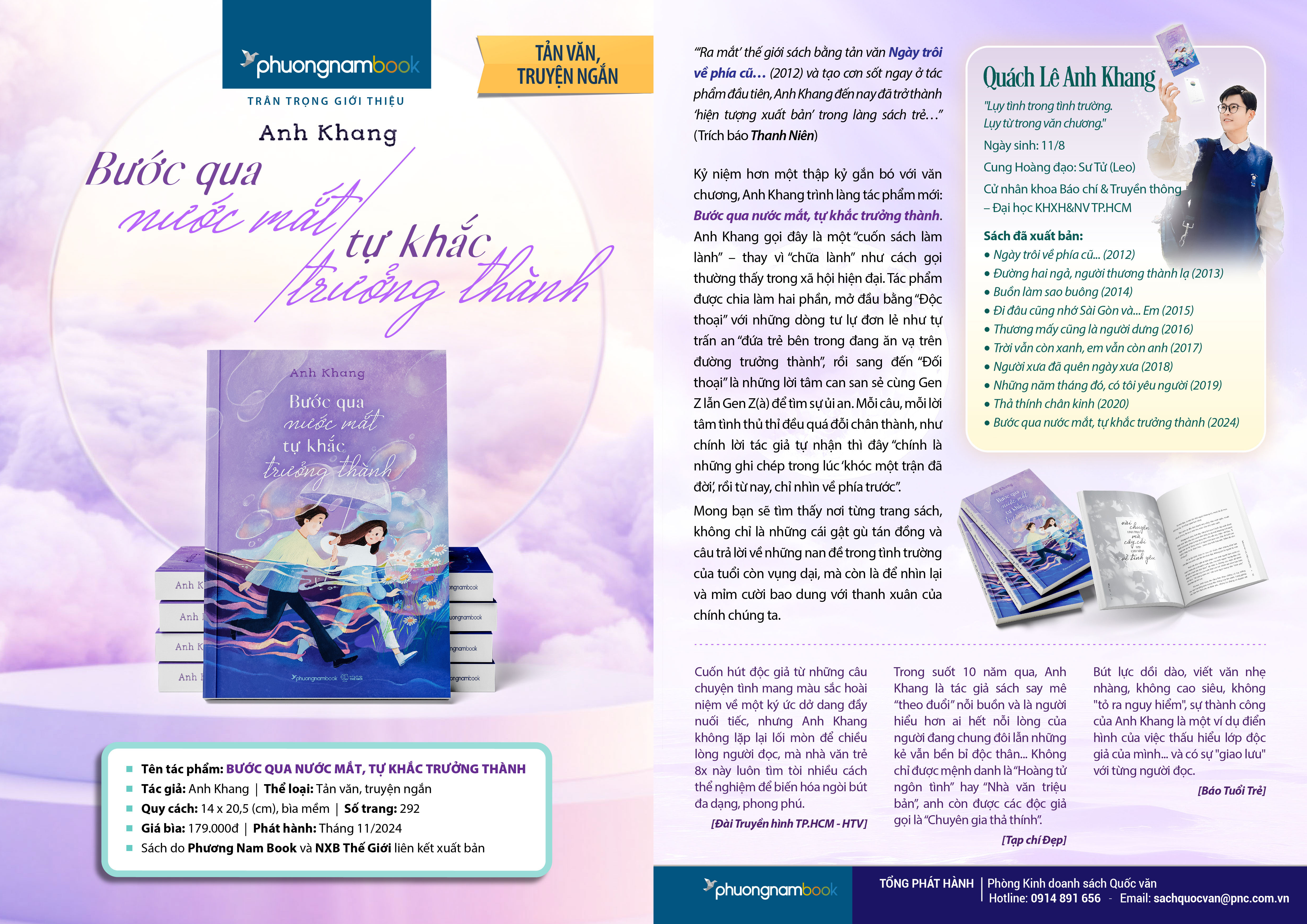 Kỷ niệm hơn một thập kỷ gắn bó với văn chương, Anh Khang trình làng tác phẩm mới: Bước qua nước mắt, tự khắc trưởng thành. Anh Khang gọi đây là một “cuốn sách làm lành” – thay vì “chữa lành” như cách gọi thường thấy trong xã hội hiện đại. Tác phẩm được chia làm hai phần, mở đầu bằng “Độc thoại” với những dòng tư lự đơn lẻ như tự trấn an “đứa trẻ bên trong đang ăn vạ trên đường trưởng thành”, rồi sang đến “Đối thoại” là những lời tâm can san sẻ cùng Gen Z lẫn Gen Z(à) để tìm sự ủi an. Mỗi câu, mỗi lời tâm tình thủ thỉ đều quá đỗi chân thành, như chính lời tác giả tự nhận thì đây “chính là những ghi chép trong lúc ‘khóc một trận đã đời’, rồi từ nay, chỉ nhìn về phía trước”.