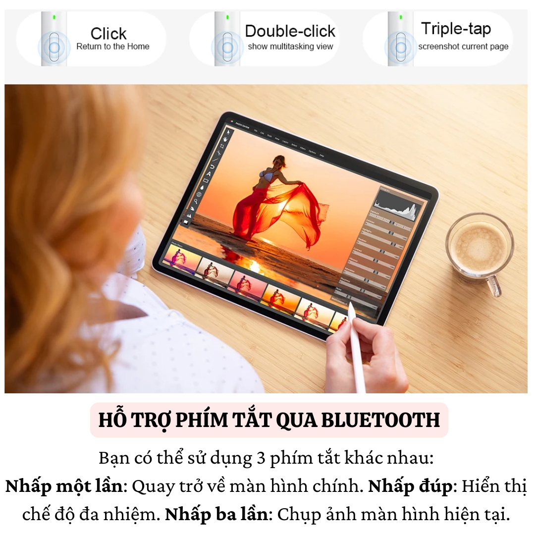 - Kết nối dễ dàng với iPad thông qua Bluetooth. Các phím tắt tiện dụng giúp điều khiển nhanh chóng: