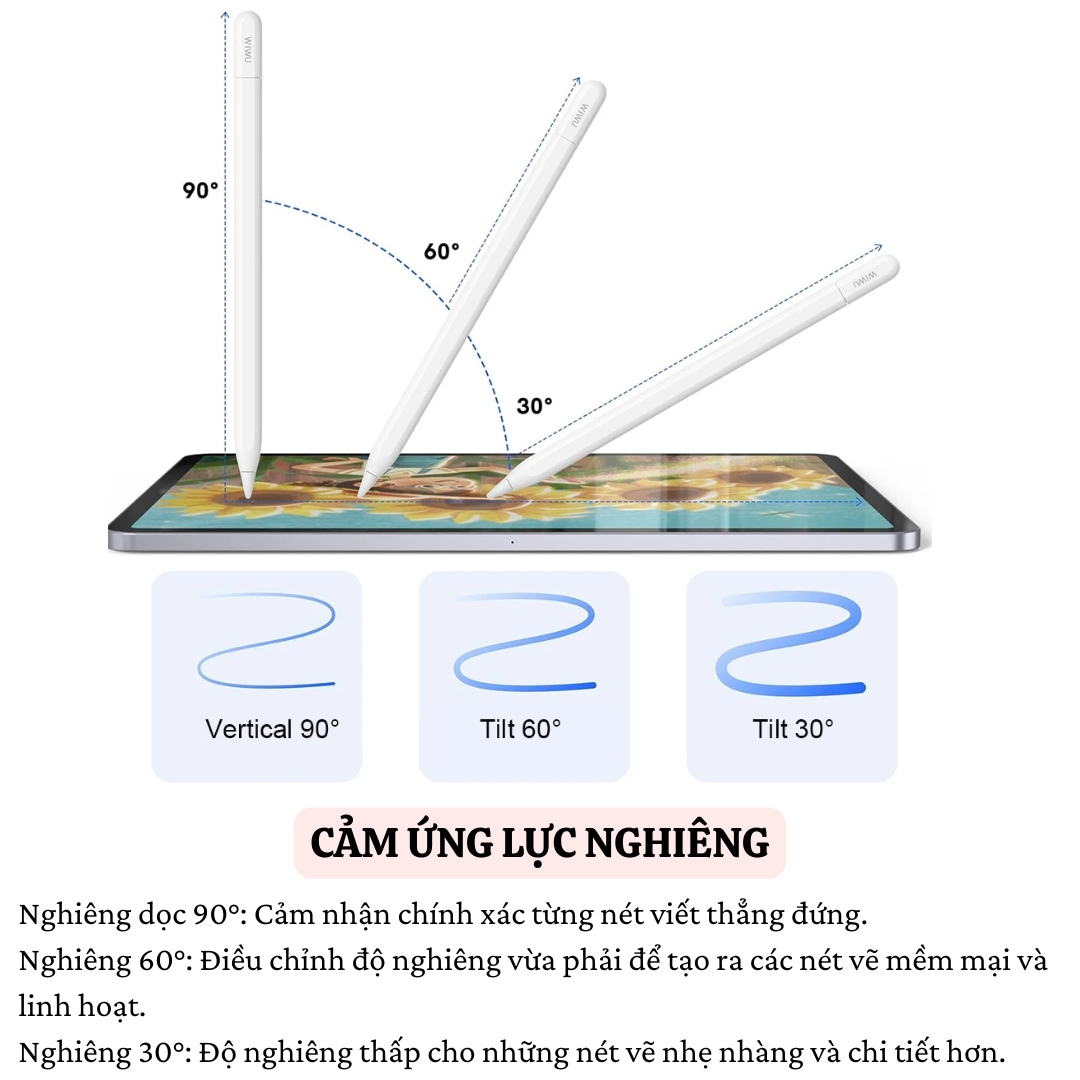 - WIWU Stylus A01 hỗ trợ cả sạc qua Type-C và sạc không dây, linh hoạt và tiện lợi trong mọi tình huống. Trải nghiệm viết vẽ chuyên nghiệp và tiện lợi WIWU Stylus A01 mang đến trải nghiệm viết và vẽ tối ưu trên iPad, giúp bạn nâng cao khả năng sáng tạo và hiệu suất làm việc. Sản phẩm là người bạn đồng hành không thể thiếu cho các nghệ sĩ, nhà thiết kế hay người dùng iPad chuyên nghiệp. Từ khóa: bút cảm ứng iPad, WIWU Stylus A01, bút vẽ iPad Pro, bút stylus sạc nam châm, bút cảm biến nghiêng.