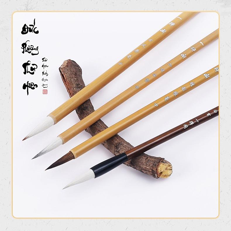 Combo bộ bút vẽ thuỷ mặc cơ bản gồm 4 cây. Cây to (kiêm hào lông hỗn hợp) vẽ lá sen, núi, thân gỗ gồ ghề. Cây lông nâu (lang hào) vẽ thân trúc, lá
