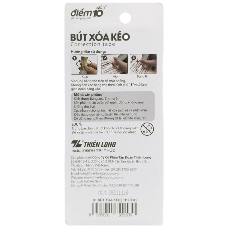 Bút Xóa Kéo TP-CT01 Kích thước băng xóa 5mm x 6m. Sản phẩm thân thiện với môi trường, không mùi, không độc hại. Xóa nhanh chóng, bề mặt xóa sạch sẽ và nhẵn mịn. Không