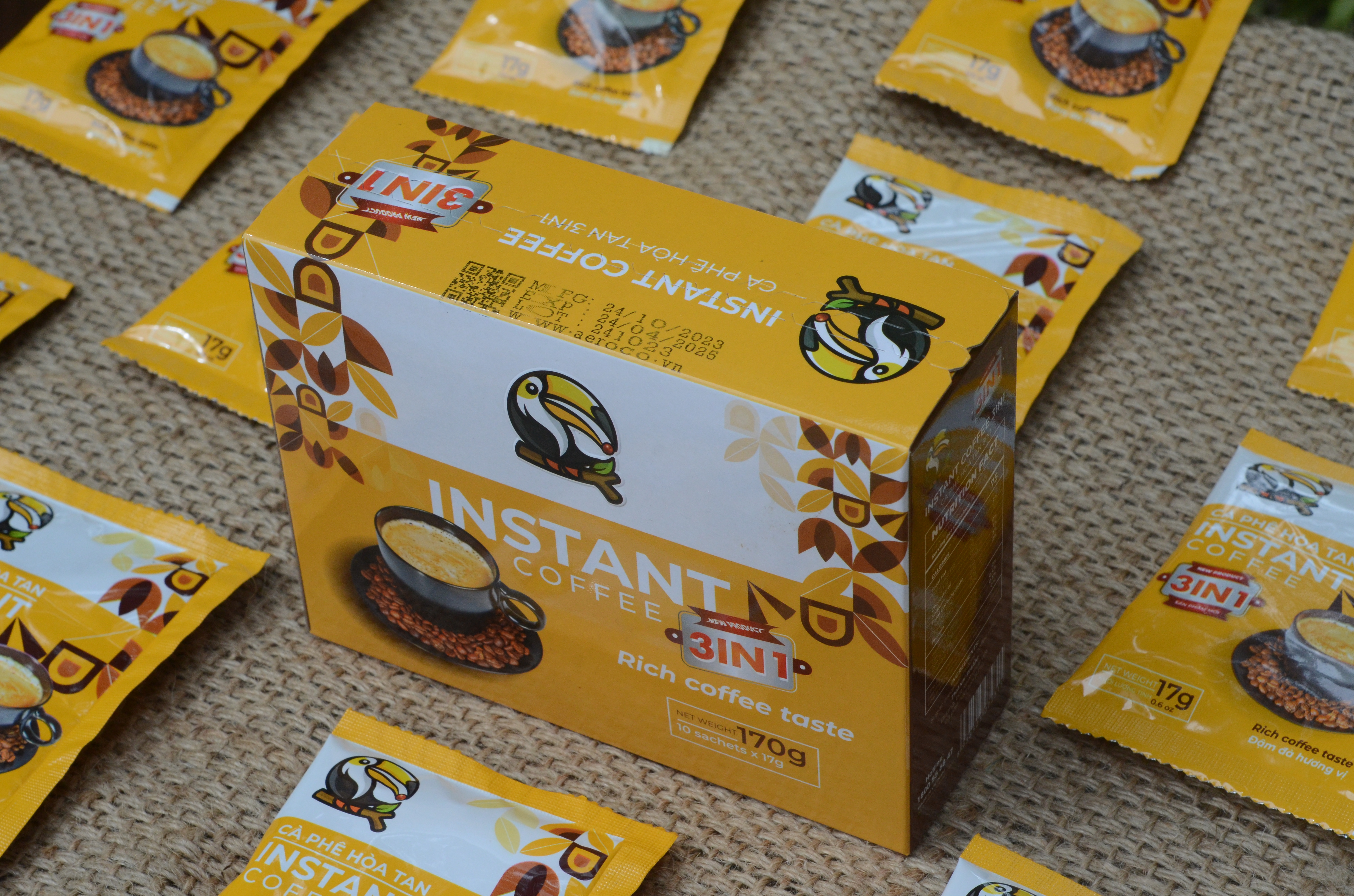 CÀ PHÊ HÒA TAN 3in1 – HỘP 170G: - Xuất xứ: Việt Nam - Thành phần: Đường, bột kem thực vật, cà phê hòa tan (13%) - Quy cách đóng gói: 10 gói x 17g/gói