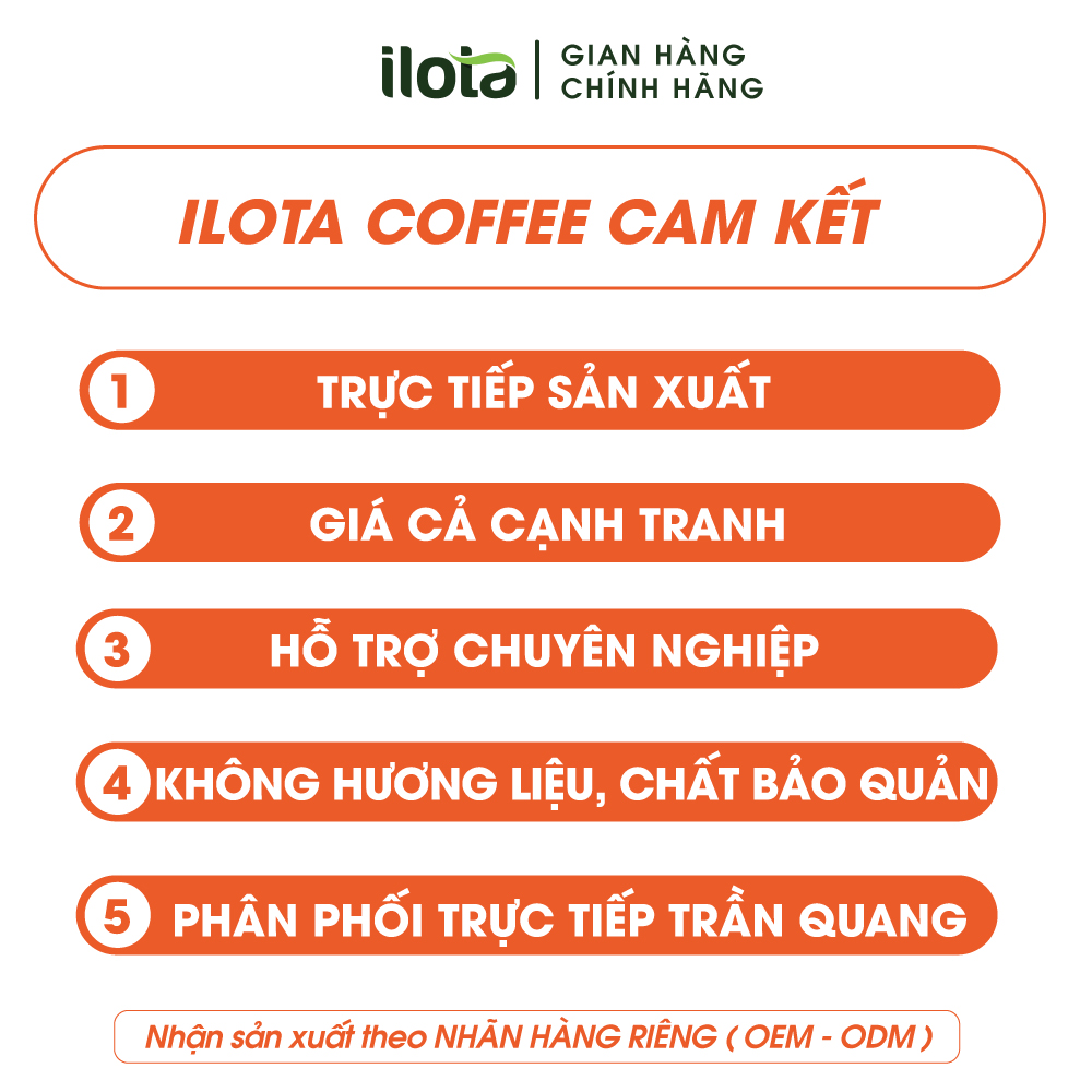 Mua tại TiktokCà phê ILOTA số 1 Espesso được chọn lựa nguyên liệu thượng hạng từ những hạt cà phê chin đỏ và rang bằng công nghệ Hotair tân tiến của máy rang Thuỵ Sĩ mang lại chất lượng vượt trội. Những dòng chảy từ pha máy với lớp bọt vàng óng và dày dặn mang đến hương vị tuyệt vời của ly espresso. Bạn cũng có thể dung để pha phin, pha coldbrew hoặc pha mokapot!