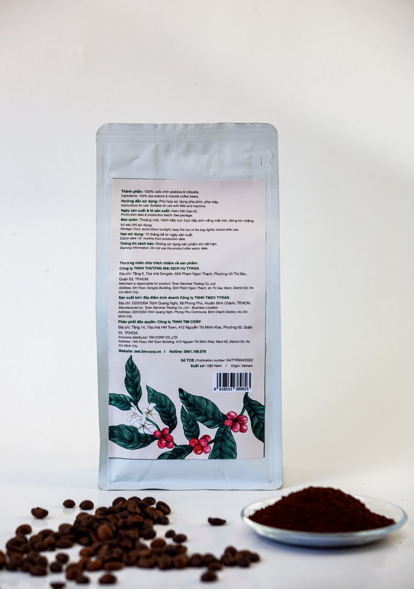 Thành phần / Ingredients: 100% Robusta. Hương vị / Flavor: Đắng đậm, sôcôla, mùi thuốc lá và hậu vị ngọt / Bold, chocolate, cigarette flavor and sweet after-taste. úi 500g / Bag 500gQuy cách / Type: