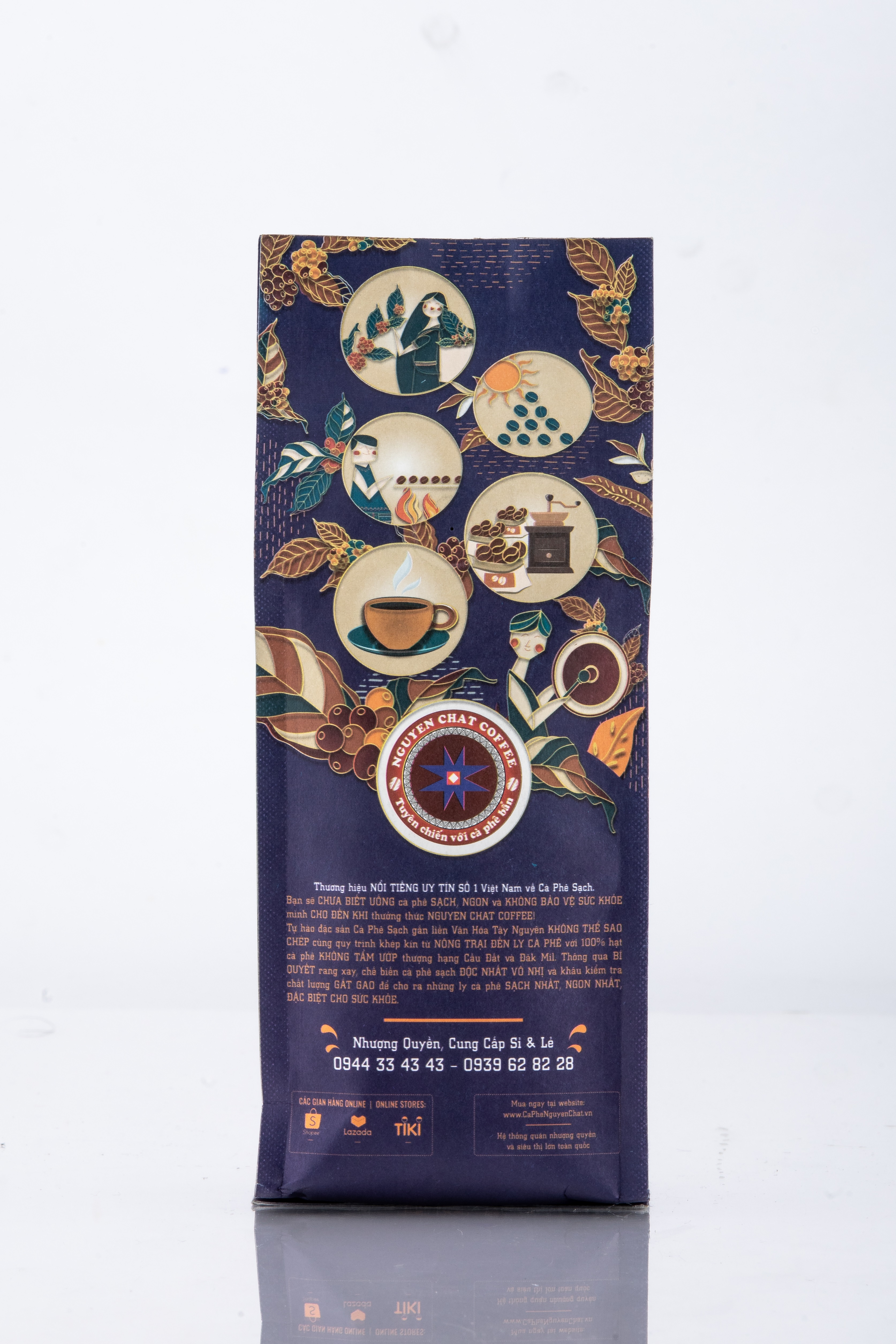 Thành phần / Ingredients: 100% Robusta. Hương vị / Flavor: Đắng đậm, sôcôla, mùi thuốc lá và hậu vị ngọt / Bold, chocolate, cigarette flavor and sweet after-taste. úi 500g / Bag 500gQuy cách / Type: