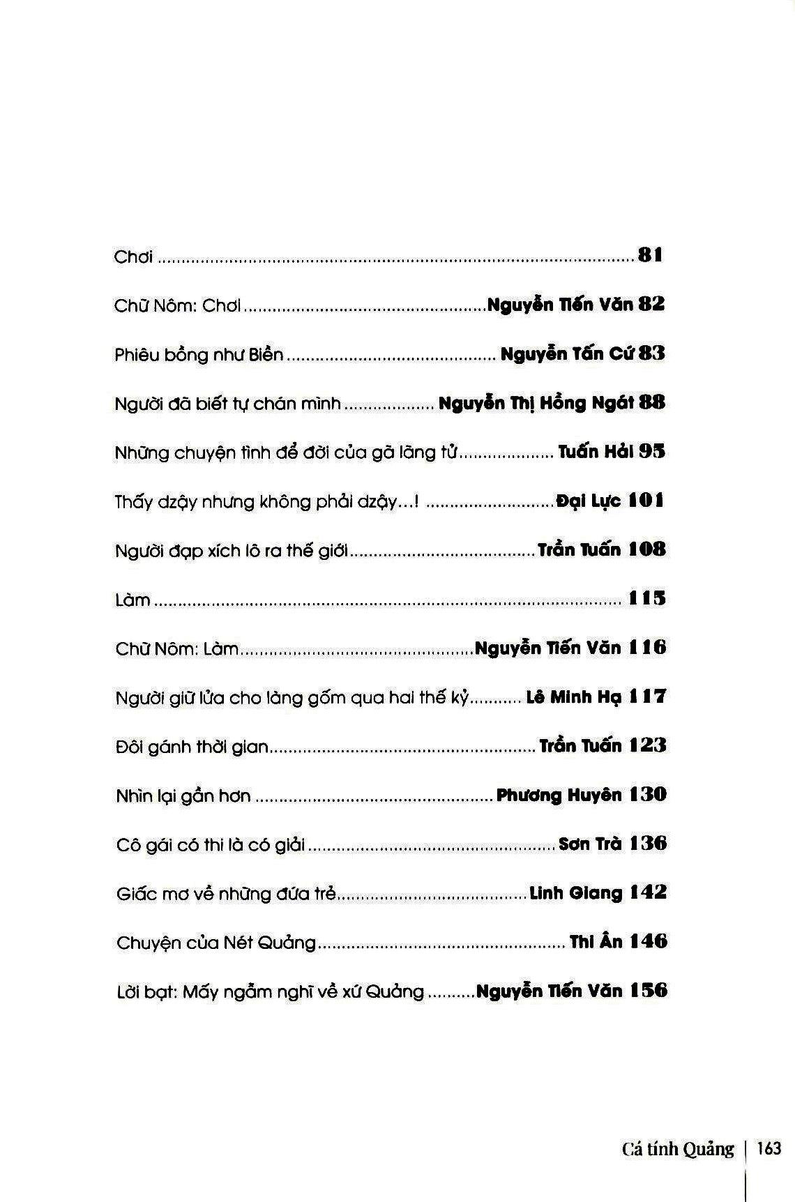 Cá Tính Quảng Xứ Quảng trong lịch sử đã là sự chung sống của Chăm-Việt, là cửa ngõ của giao thuơng quốc tế với nhiều bến cảng lớn, nơi Hội An là thành phố toàn cầu từ thời phong kiến, nên tinh thần dân chủ, việc chấp nhận sự khác biệt đã thành bản sắc. Như là một tiếp nối, các nhân vật trong sách này cũng được chọn lựa với tinh thần bình đẳng và dân chủ như vậy. Trong công việc riêng, mỗi nhân vật có những đóng góp, những gợi hứng đáng trân quý, các tác giả dựa vào đó để viết về họ, chứ không có ý phân “chiếu trên, chiếu dưới”. Thật vậy, tự trong mỗi ngành nghề thì còn có thể bàn về chuyện cao thấp, lớn nhỏ, chứ cà một xứ sở, một vùng văn hóa, với lịch sử dài và phức tạp, đâu dễ để nhận định ai quan trọng ai tầm thường, ai lớn ai nhỏ. Mà nếu thật sư muốn phân cao thấp, thì tiêu chí nào có thể phù hợp và công bằng với các ngành nghề, các xuất phát điểm quá khác nhau. Chính vì vậy, khi đọc sách, nếu độc giả thích nhân vật A hơn B, hoặc thấy c lớn lao hơn D, ấy cũng là bình thường, là cảm nhận riêng, chứ tự cuốn sách không hướng đến điều đó. Nhiều bài trong sách này từng được in trên báo và tạp chí, nay tác giả tự nhuận sắc để góp mặt trong tuyển tập này. Một vài bài in theo sự lựa chọn, biên tập của chính nhân vật trong bài. Sách với bìa và cover từng phần do họa sĩ Lê Kinh Tài thiết kế, biến tấu từ hình tuợng con tò he, khá phổ biến một thời tại xứ Quảng, ngày nay còn thấy nhiều ở Hội An và các chợ làng xã. Tò he có lẽ là sản phẩm đi cùng bước chân mở cõi vào Nam, mà xứ Quảng - với trắc trở của đèo Hải Vân và cuộc đối thoại trực tiếp với văn minh Chăm - là một cột mốc lớn. Nếu có một chút so sánh, có thể thấy tò he ở xứ Quảng có nhiều nét riêng so với tò he ở làng Xuân La (Phượng Dực, Phú Xuyên, Hà Nội) - vốn đuợc cho là một trong những nơi phát xuất của nghề tò he. Tìm về cá tính Quảng, bản sắc Quả đôi khi cũng là tìm về nét riêng của những vật thể và phi vật thể như vậy.