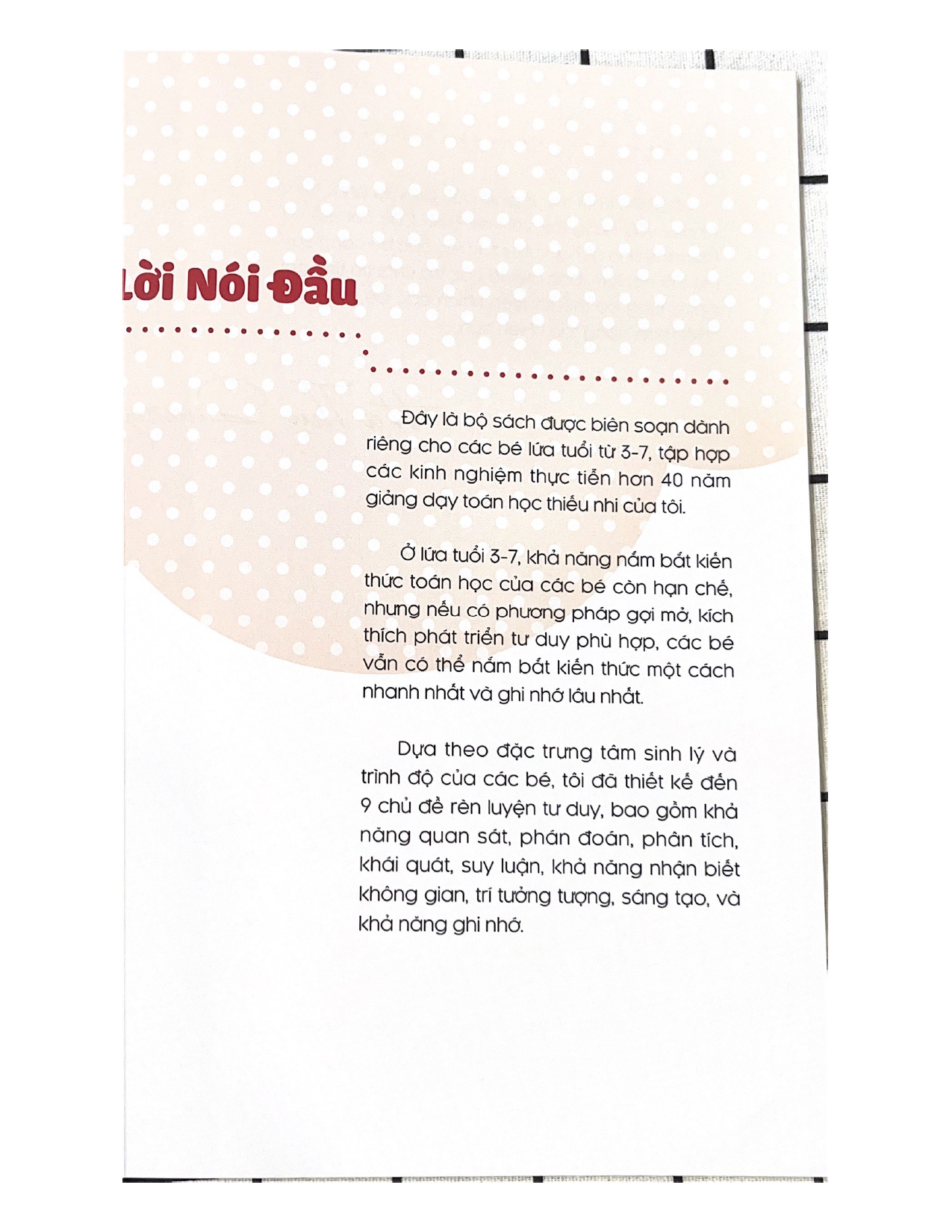 Bộ sách đặc biệt được biên soạn dành riêng cho các bé ở độ tuổi từ 3–7, giúp bồi dưỡng TƯ DUY TOÁN HỌC, xây dựng và phát triển khả năng QUAN SÁT, PHÁN ĐOÁN, PHÂN TÍCH, KHÁI QUÁT, SUY LUẬN, TƯỞNG TƯỢNG, SÁNG TẠO, GHI NHỚ,…