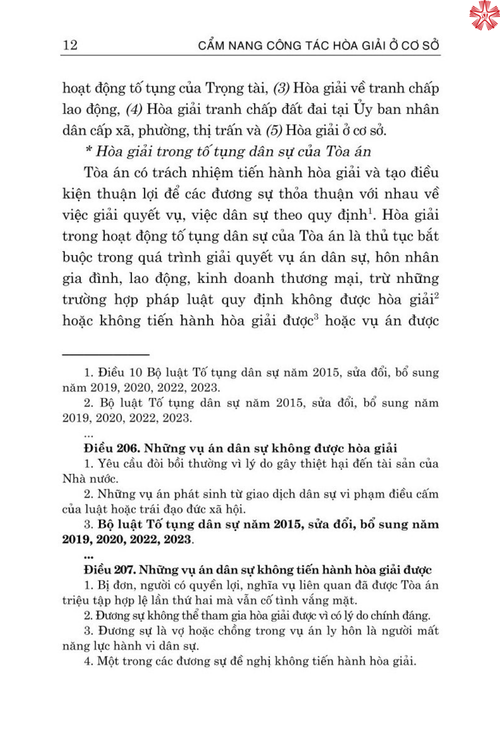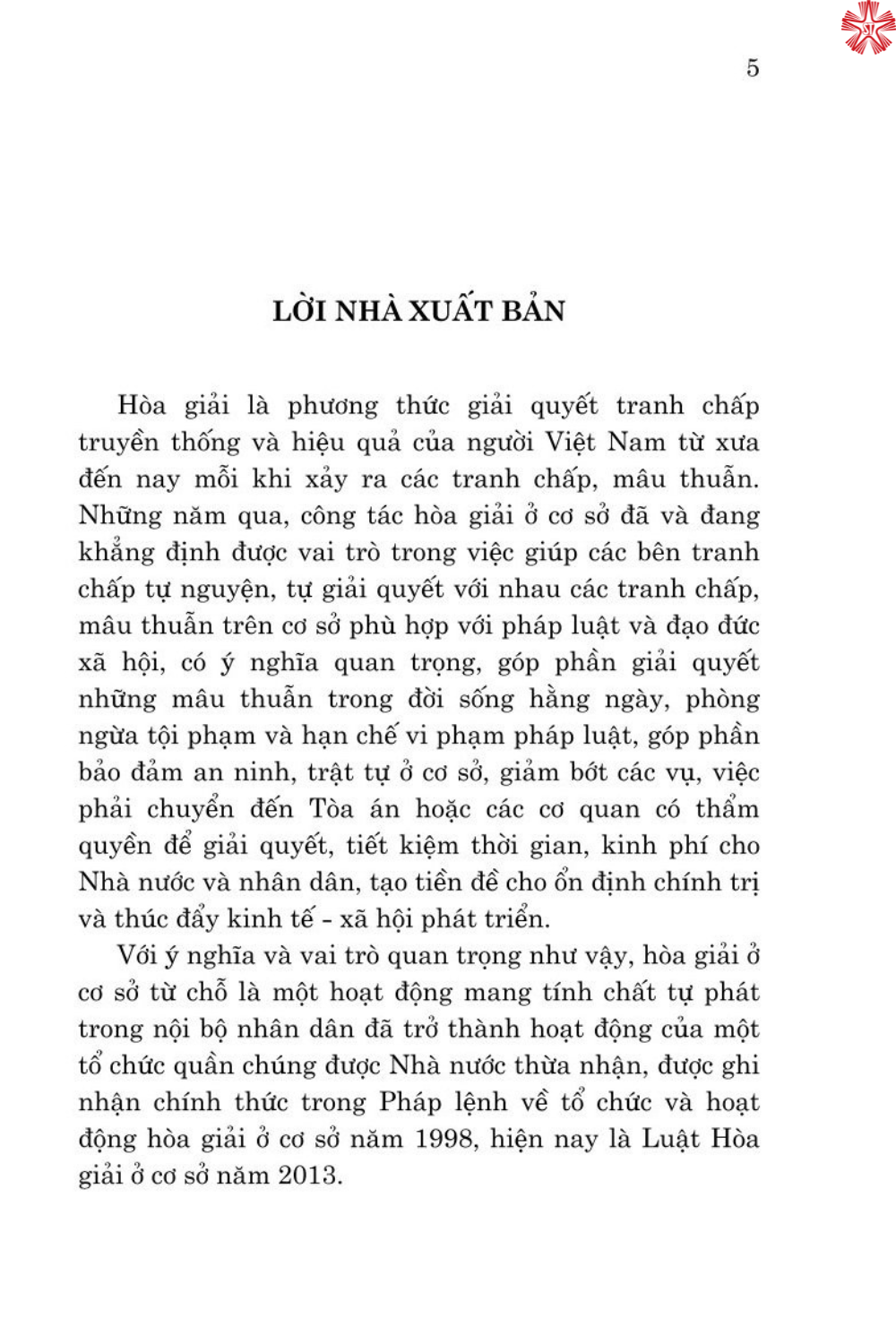 Công tác hòa giải ở cơ sở là một việc làm có ý nghĩa rất thiết thực đối với đời sống xã hội hiện nay nhằm mang lại niềm vui cho mọi người, mọi nhà, giữ gìn trật tự, an toàn xã hội, nâng cao ý thức pháp luật của người dân. Do vậy, việc các chính quyền ở cơ sở cần nắm vững những thông tin liên quan đến công tác hòa giải để giải quyết những mâu thuẫn, tranh chấp nhỏ trong nhân dân là một việc làm cần thiết. Đánh giá tầm quan trọng đó của công tác hòa giải, cuốn sách Cẩm nang công tác hòa giải ở cơ sở được xuất bản sẽ giúp chúng ta nhận thức được vấn đề đã nêu.