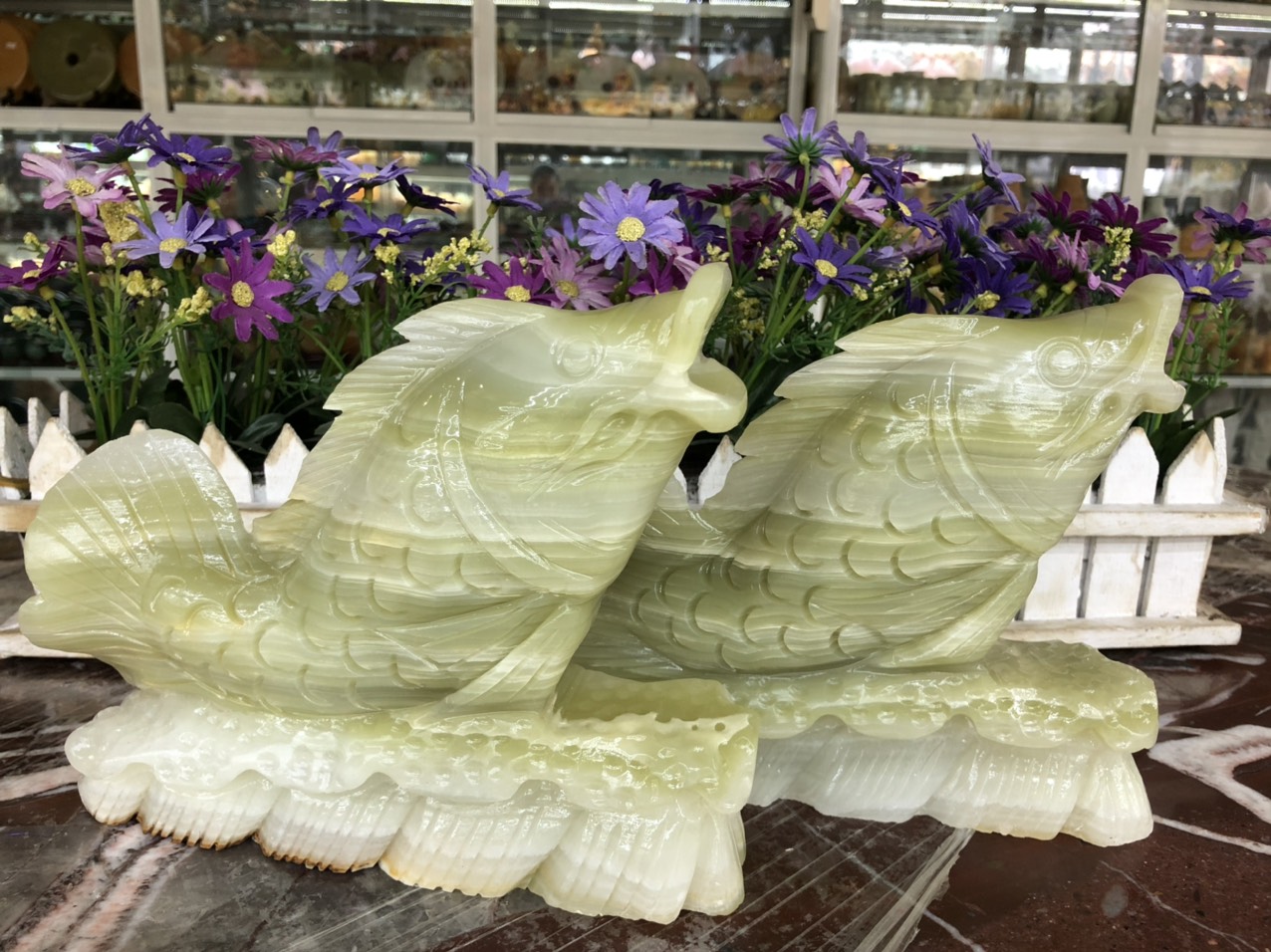Tác phẩm cá chép vượt vũ môn chất liệu đá bạch Ngọc onyx tự nhiên đc các nghệ nhân chế tác tinh sảo