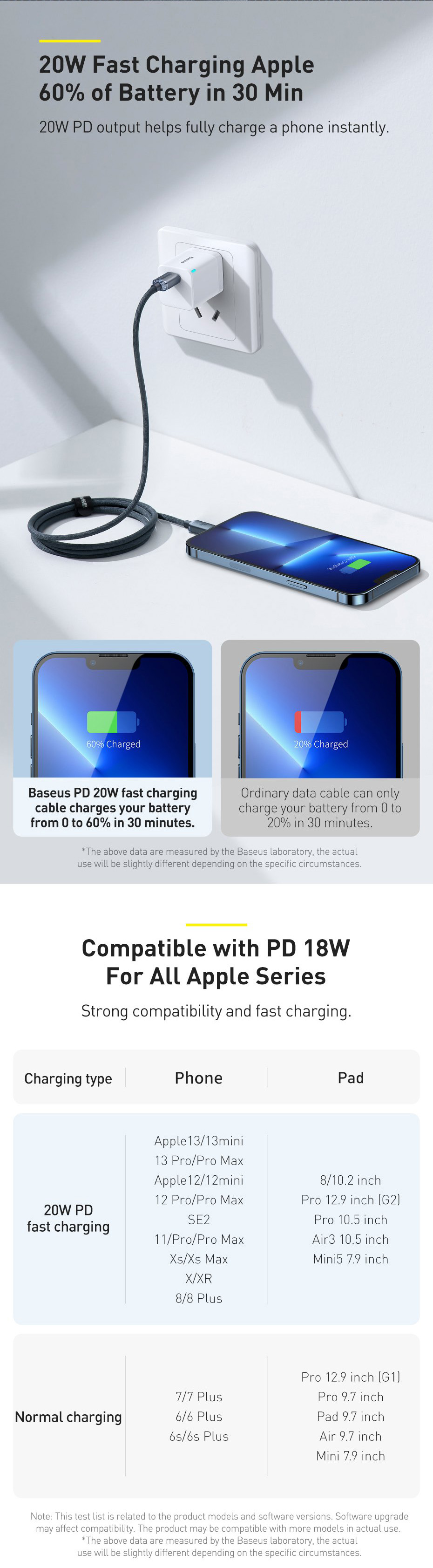 - Hỗ trợ công suất đến 20W đối với cáp USB-C to Lai-nin cho tốc độ sạc nhanh hơn 40% so với các loại cáp thông thường.