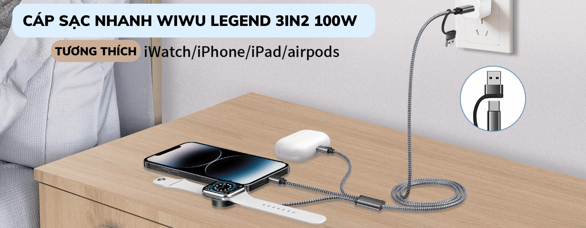Sản phẩm: Cáp sạc nhanh 3 trong 2 Legend 100W Mẫu: Wi-C050 Cổng: USB-A+USB-C sang Bộ sạc USB-C +iP+Watch Nguồn điện (USB-A sang USB-C): 18W; (USB-A đến iP): 12W; (USB-A đến Watch): 2,5W (USB-C sang