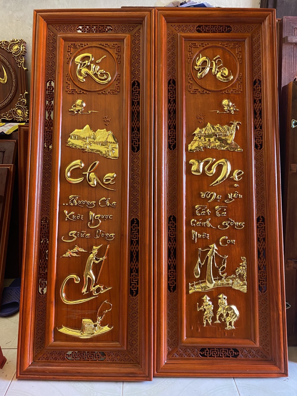 ✨Cặp tranh câu đối treo tường trạm khắc chữ cha mẹ bằng gỗ hương đỏ ,tô sơn son dát vàng cao cấp kt 37×117×3cm