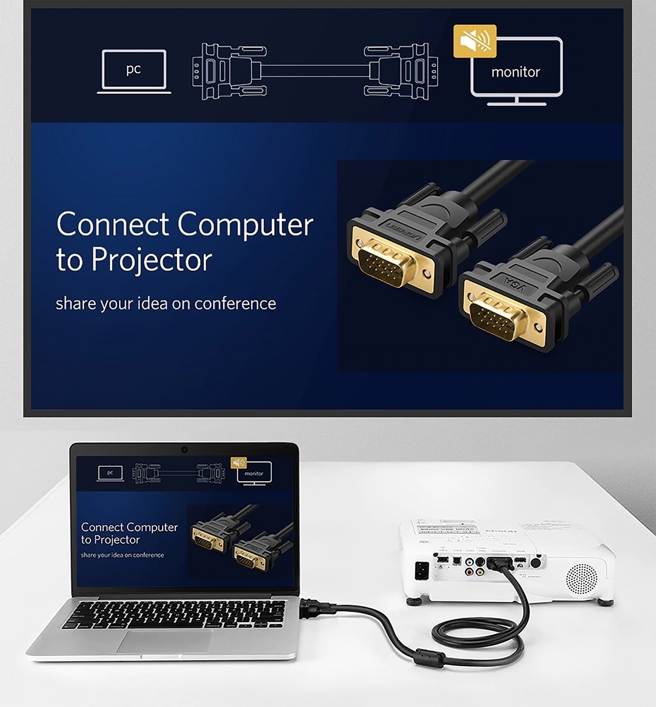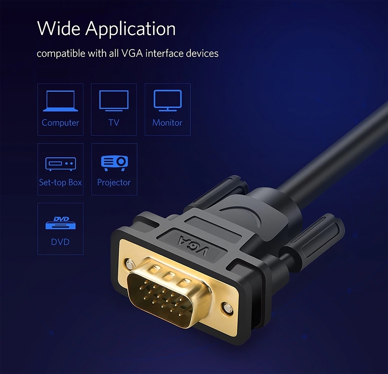 Ugreen 11673 dùng từ Máy tính PC, laptop sang màn hình hoặc máy chiếu. Dây VGA Ugreen được dùng nhiều trong trường học, ngân hàng, văn phòng truyền hình yêu cầu chất lượng tốt.