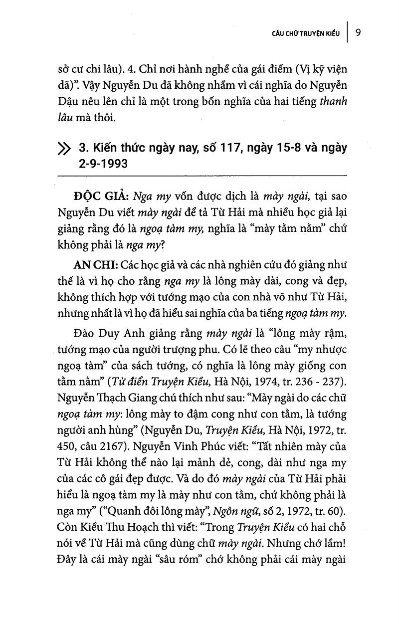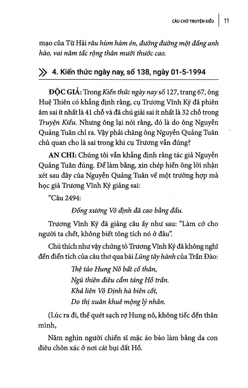 Từ những năm 90 của thế kỷ XX cho đến nay, các bài viết của An Chi về Truyện Kiều đăng trên các báo, tạp chí luôn được bạn đọc yêu thích, tán thưởng. Các bài viết phần nhiều là câu trả lời cho độc giả hỏi về những câu từ, điển tích trong Truyện Kiều, qua đó tác giả diễn giải theo góc nhìn mới, ý kiến riêng có của mình. Cũng có khi, An Chi đối thoại, tranh luận với nhiều tác giả, học giả về từng câu chữ để đưa ra cách hiểu hợp lý nhất, đúng nhất có thể.