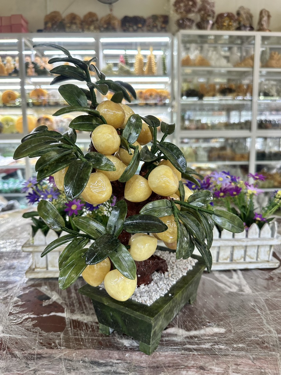 Tượng Cây Đào mới vàng 13 quả canxit vàng tự nhiên cao 40cm x ngang 34cm x sâu 20cm tài lộc hợp ACE mệnh kim thổ Trưng bày phòng khách rất là sang Cây đào