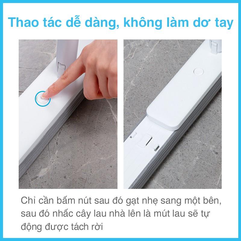 -Chỉ cần bấm nút sau đó gạt nhẹ sang một bên, sau đó nhấc cây lau nhà lên là mút lau sẽ tự động được tách rời