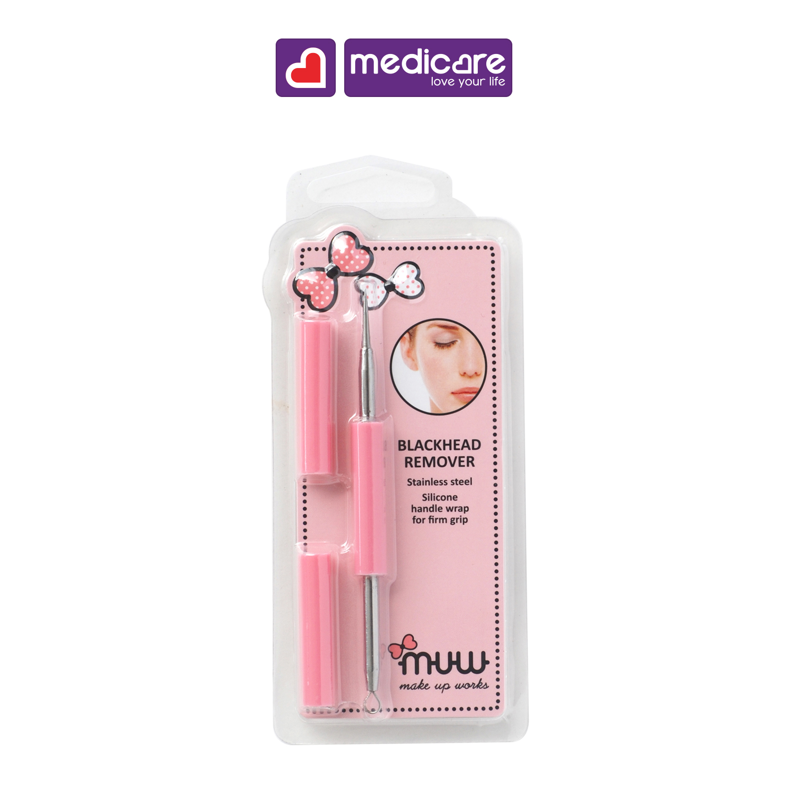CÂY NẶN MỤN MUW – CÓ ĐỒ BỌC SILICON   BASICARE thương hiệu cao cấp nổi tiếng thế giới chuyên về các dụng cụ làm đẹp chất lượng cao & thiết kế chuyên nghiệp; BASICARE được phân phối rộng rãi trên hơn 40 quốc gia; hiện đang được MEDICARE phân phối độc quyền tại Việt Nam. Giờ đây, BASICARE tung ra dòng sản phẩm làm đẹp với thiết kế cực kì dễ thương và đáng yêu dành riêng cho giới trẻ, cho bạn nhiều sự lựa chọn hơn đối với các dụng cụ cá nhân.   CÔNG DỤNG Làm từ thép không gỉ, độ bền cao   HƯỚNG DẪN SỬ DỤNG Không dùng tay đẻ nặn mụn đầu đen, vì sẽ làm tổn thương da của bạn Rửa mặt sach sẽ với nước ấm trước khi sử dụng cây nặn mụn Nhẹ nhàng đặt cây nặn mụn vào phía trên mụn đầu đen và ấn xuống Rửa phần da vừa mới nặn với nước ấm Sau khi sử dụng nên cất cây nặn mụn vào bao   Luôn đọc kỹ thông tin in trên bao bì. Sử dụng theo hướng dẫn. Chúng tôi luôn cố gắng đảm bảo tất cả thông tin về công dụng và hướng dẫn sử dụng của sản phẩm luôn được cập nhật đầy đủ và chính xác trên trang web. Tuy nhiên, để đảm bảo an toàn, quý khách vui lòng kiểm tra nhãn trên bao bì sản phẩm tại cửa hàng trước khi sử dụng.