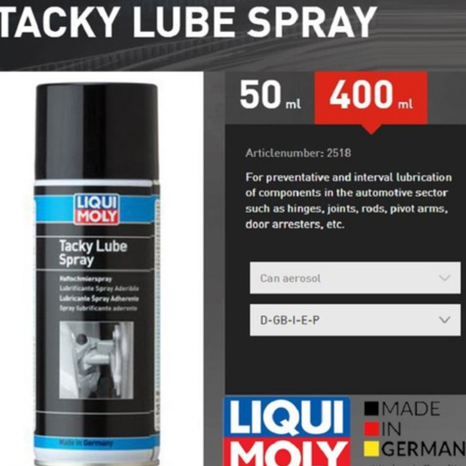 Mua tại TiktokChai xịt mỡ bò nước cho chốt cửa , bản lề Liqui Moly Tacky Lube Spray 400ml LIQUI MOLY 2518 Là mỡ tổng hợp chất lượng cao, chịu nhiệt, độ dính cao và khả năng bôi trơn tối ưu. Sau khi dung môi bay hơi, để lại một lớp mỡ mềm cực dính.Dùng để bôi trơn thường xuyên cho các chi tiết trong xe như bản lề, khớp nối, thanh nối, thanh trượt, trục quay, vòng bi, cần sang số và chốt cửa…