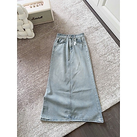 Chân váy jeans xanh dáng dài chữ A xẻ tà phía sau