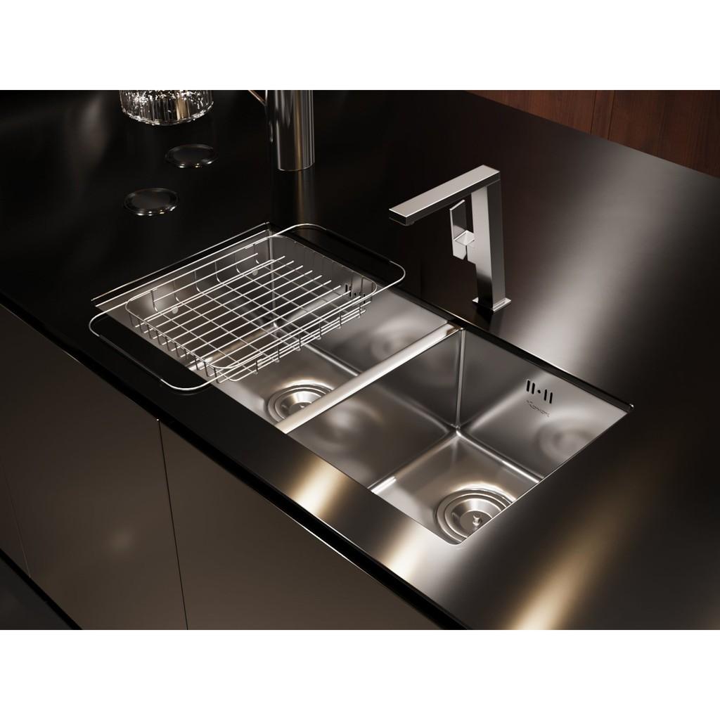 Mã sản phẩm: Cube 7544DUKích thước (mm): 750*440*220Kích thước hố (mm): 340*400; 340*400Cắt đá (mm): 710*400 (Cắt đá lắp âm)Độ dày (mm): 1.0Chất liệu: SS304Full set kèm Siphon, giá úp bát inox...