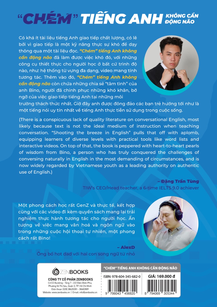 Mua tại TiktokChém Tiếng Anh Không Cần Động Não “Phần lớn người Việt đều biết tiếng Anh NHIỀU HƠN HỌ NGHĨ, chỉ là họ chưa biết làm thế nào để đưa ý tưởng thành lời nói mà thôi!” - Bino chém tiếng Anh. Biết nhiều tiếng Anh nhưng không… nói được - điều này có đúng với bạn không? Sao 12 năm học tiếng Anh không giúp chúng ta xử lý được những cuộc trò chuyện thông thường? Sao điểm tiếng Anh trên lớp toàn 9, 10 nhưng gặp Tây lại ấp a ấp úng? Sao sở hữu điểm IELTS 7.0+ nhưng vẫn “sốc ngôn ngữ” khi ra nước ngoài? Nguyên nhân có lẽ nằm nhiều ở cách giáo dục truyền thống tại Việt Nam - vốn nặng tính học thuật, thiếu “hơi thở đời thường”, ít luyện tập và ít nhấn mạnh vào thứ ngôn ngữ tự nhiên mà người bản xứ thường nói với nhau. “Chém Tiếng Anh Không Cần Động Não” của tác giả Bino - chủ kênh T.ikT.ok binochemtienganh với hơn 750 nghìn người theo dõi - được thiết kế để giải quyết điểm khó cố hữu trên. Với cách tiếp cận nặng tính thực tiễn, thực chiến và luyện tập - đây chính là cuốn sách luyện nói tiếng Anh dành cho những ai đang muốn thực sự nói được tiếng Anh trong đời sống. Để đạt được mục tiêu đó, “Chém Tiếng Anh Không Cần Động Não” có những đặc điểm nổi bật sau: ★ 500+ mẫu câu thông dụng thuộc 12 chủ đề thiết thực (tương ứng 12 chương): Từ chào hỏi, giới thiệu bản thân; hội thoại ở công sở, khi mua sắm; diễn tả sở thích, thời tiết, lịch trình, di chuyển… Đây là những chủ đề đơn giản nhất, có vẻ quá cơ bản, nhưng sẽ đảm bảo bạn TỒN TẠI ĐƯỢC nếu lỡ có một ngày lạc chân ra ngoại quốc. ★ Tất cả các đoạn hội thoại đều có văn phong và từ vựng đúng cách nói chuyện của người bản xứ. ★ Với mỗi hội thoại, tác giả cung cấp 1 video ngắn để bạn có thể luyện nghe - nói 1:1 với Bino - ngay tại nhà mình, hết sức tiết kiệm, thuận tiện, tự tin. Theo Bino, sự lặp đi lặp lại như-một-đứa-trẻ, “mở miệng ra và nói ,nói, nói không ngừng nghỉ” chính yếu tố quan trọng để bạn hình thành vốn từ vựng chủ động và thói quen phản xạ, qua đó nói tiếng Anh trôi chảy, lưu loát hơn. Do đó, các video luyện nghe - nói 1:1 trong cuốn sách này đóng vai trò như một “vũ khí tối thượng” giúp bạn nâng trình kỹ năng giao tiếp. ★ 1000+ từ vựng, tiếng lóng, idiom, cách nói tắt và các cách diễn đạt tự nhiên, bình dân. ★ Những tips, tricks nói và phát âm tiếng Anh sao cho gọn gàng, đơn giản, không rườm rà. Đó đều là những đúc kết xương máu của tác giả sau nhiều năm quan sát người bản xứ lẫn bản thân tự nghiệm ra khi anh làm việc, giao tiếp tiếng Anh trong những môi trường đòi hỏi phản xạ nhanh. ★ Những mẹo học ngôn ngữ chất như nước cất của Bino sau nhiều năm học 5 thứ tiếng khác nhau. Chẳng hạn: “Tại sao nhiều người học tiếng Anh qua phim lại không hiệu quả?”; “Hãy để tiếng Việt giúp bạn học tiếng Anh”; “Hãy đặt nhiều câu hỏi HOW hơn thay vì WHY!” ★ Các hướng dẫn gần gũi, hoàn toàn bằng tiếng Việt và đậm chất gen Z!. ★ Hệ thống từ vựng siêu đơn giản, phù hợp với cả các bạn mất gốc tiếng Anh, các bạn ở trình độ beginner (sơ cấp), lẫn những ai đang ở trình độ cao hơn nhưng đang muốn “bình dân hoá” văn nói của mình. ★ Quà tặng: Ngoài bộ video luyện nghe - nói 1:1, bạn cũng sẽ nhận được sổ tay học từ vựng siêu xịn sò từ Bino! Với cuốn sách này, tác giả muốn góp phần thay đổi cách học và tiếp cận tiếng Anh của người Việt Nam nói chung - thực dụng hơn, hiệu quả hơn và tự tin hơn. “Muốn nói tốt hơn, bạn phải luyện tập nói nhiều hơn. Tất cả những gì bạn đọc được trong cuốn sách đều cần được ĐỌC TO BẰNG MIỆNG, NÓI TO THÀNH TIẾNG cùng Bino - không chỉ một mà rất rất nhiều lần”, Bino chia sẻ. Nào, bạn đã sẵn sàng cùng Bino bước vào hành trình “chém tiếng Anh không cần động não” chưa? Lời khen tặng dành cho “Chém Tiếng Anh Không Cần Động Não”: ★ "Có khá ít tài liệu tiếng Anh giao tiếp chất lượng, có lẽ bởi vì giao tiếp là một kỹ năng thực sự khó để dạy thông qua một tài liệu đọc. “Chém Tiếng Anh Không Cần Động Não” đã làm được việc khó đó, với những công cụ thiết thực cho người học ở bất cứ trình độ nào, như: hệ thống từ vựng đa dạng, video mang tính tương tác. Thêm vào đó, “Chém Tiếng Anh Không Cần Động Não” còn chứa những chia sẻ ‘tâm tình’ của anh Bino, người đã chinh phục những khó khăn, bỡ ngỡ của việc giao tiếp tiếng Anh tại những môi trường thách thức nhất, và giờ được đông đảo các bạn trẻ hướng tới như là một tiếng nói uy tín nhất về tiếng Anh thực tiễn sử dụng trong cuộc sống” – Đặng Trần Tùng - TIW’s CEO/Head teacher, 6 time IELTS 9.0 holder ★ “Một phong cách học rất GenZ và thực tế, kết hợp cùng với các video duet mang lại trải nghiệm thực hành tương tác cho n